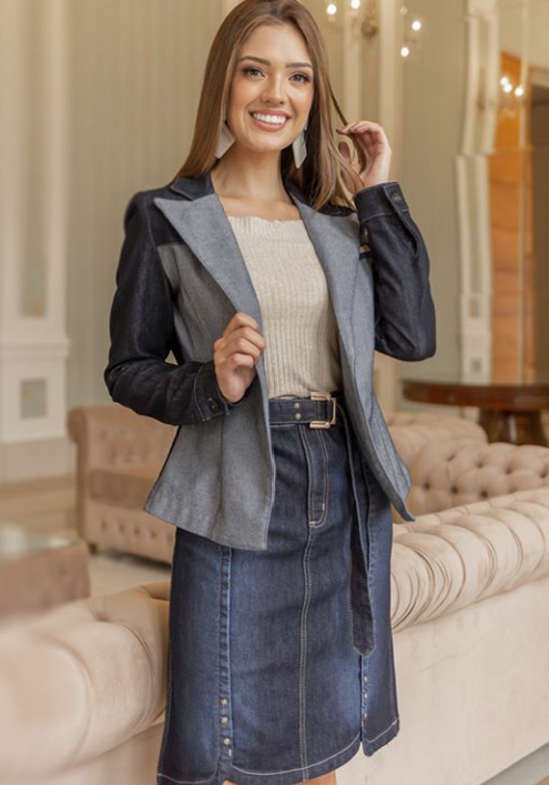 Jaqueta estilo blaser tecido jeans 100% sem elastano com duas tonalidades na mesma peça.