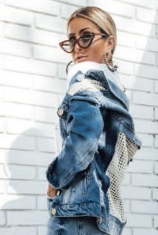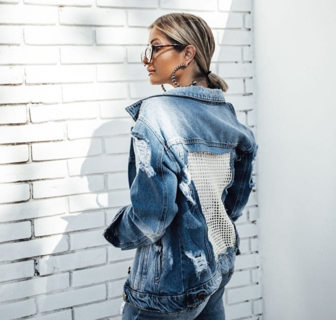 Jaqueta jeans levemente destonada, jeans de excelente qualidade trabalhada com crochê na parte traseira e proximo a gola. Veste super bem além de ser uma peça moderna e diferente