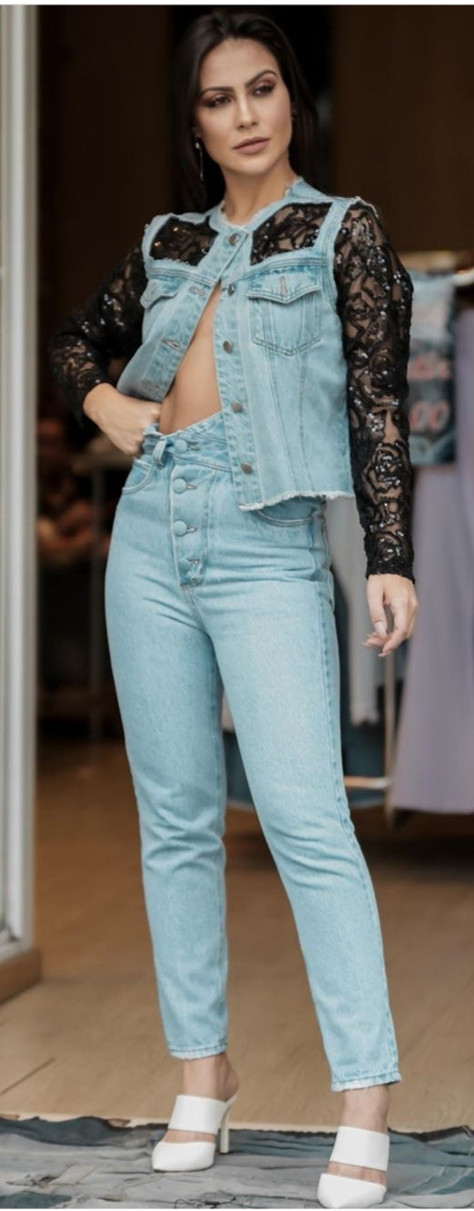 Jaqueta Jeans sem lycra com detalhes em renda preta trabalhada com miçangas nas mangas e proximo ao ombro. Jeans de excente qualidade botões e bolsos frontais.