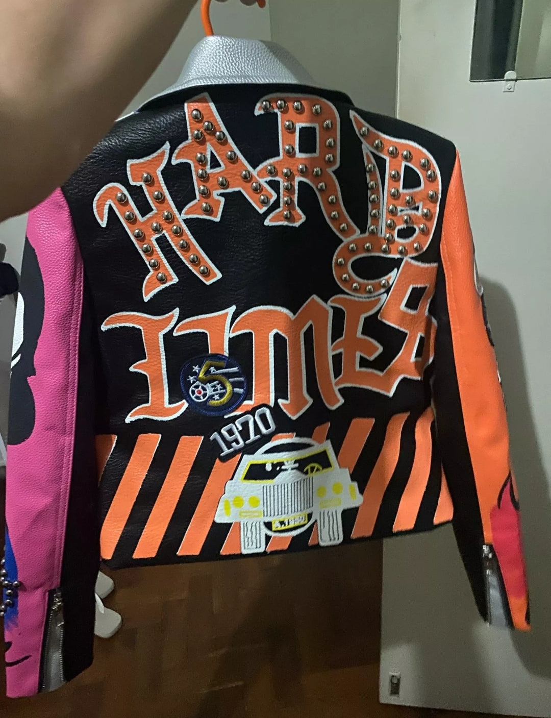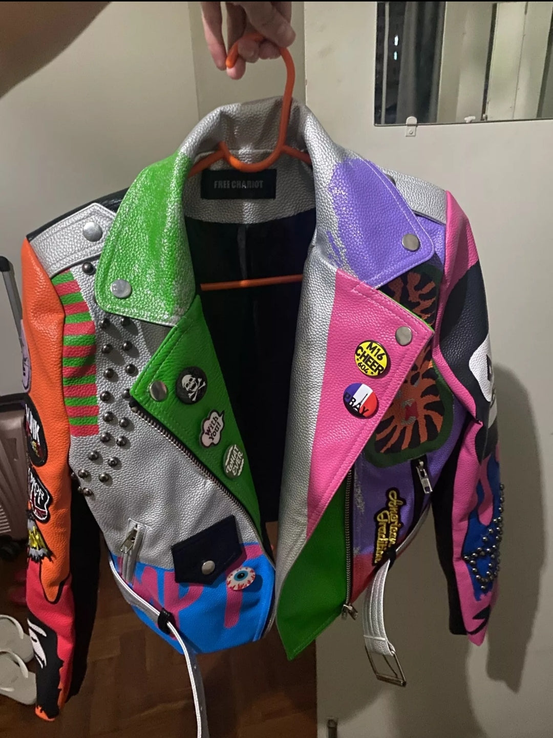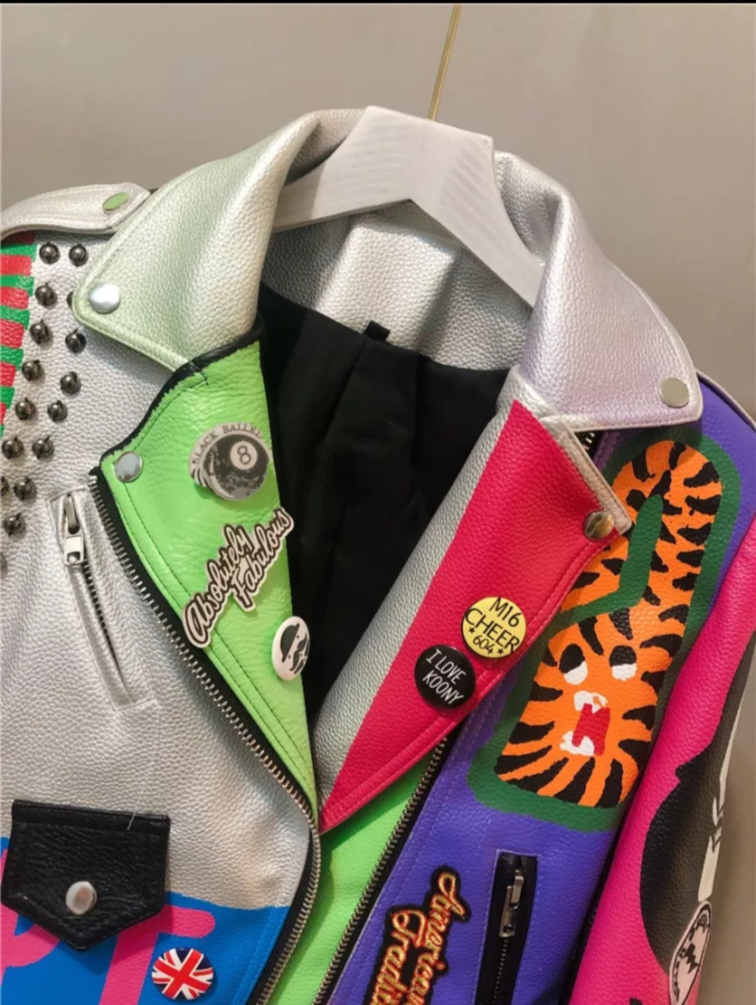 Jaqueta em couro sintético customizada em stikers e pintura , forrada internamente, manga longa disponível do 36 ao 44