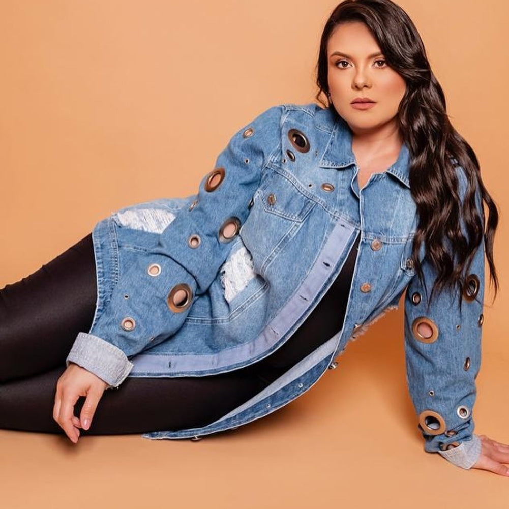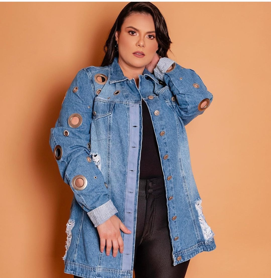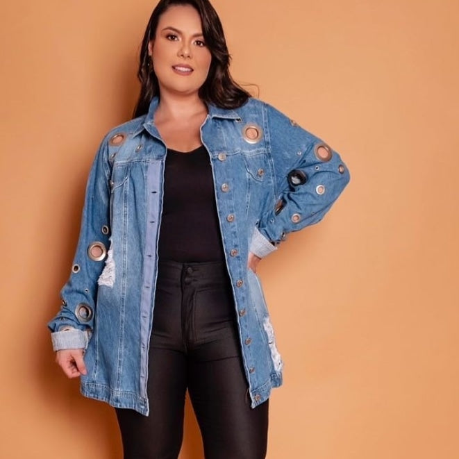 Jaqueta em Jeans com detalhes em ilhós na fronta e mangas, Max jaqueta Olver . Sem lycra disponível do 36 ao 54