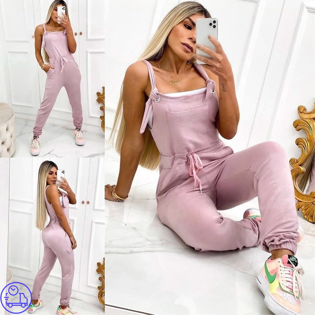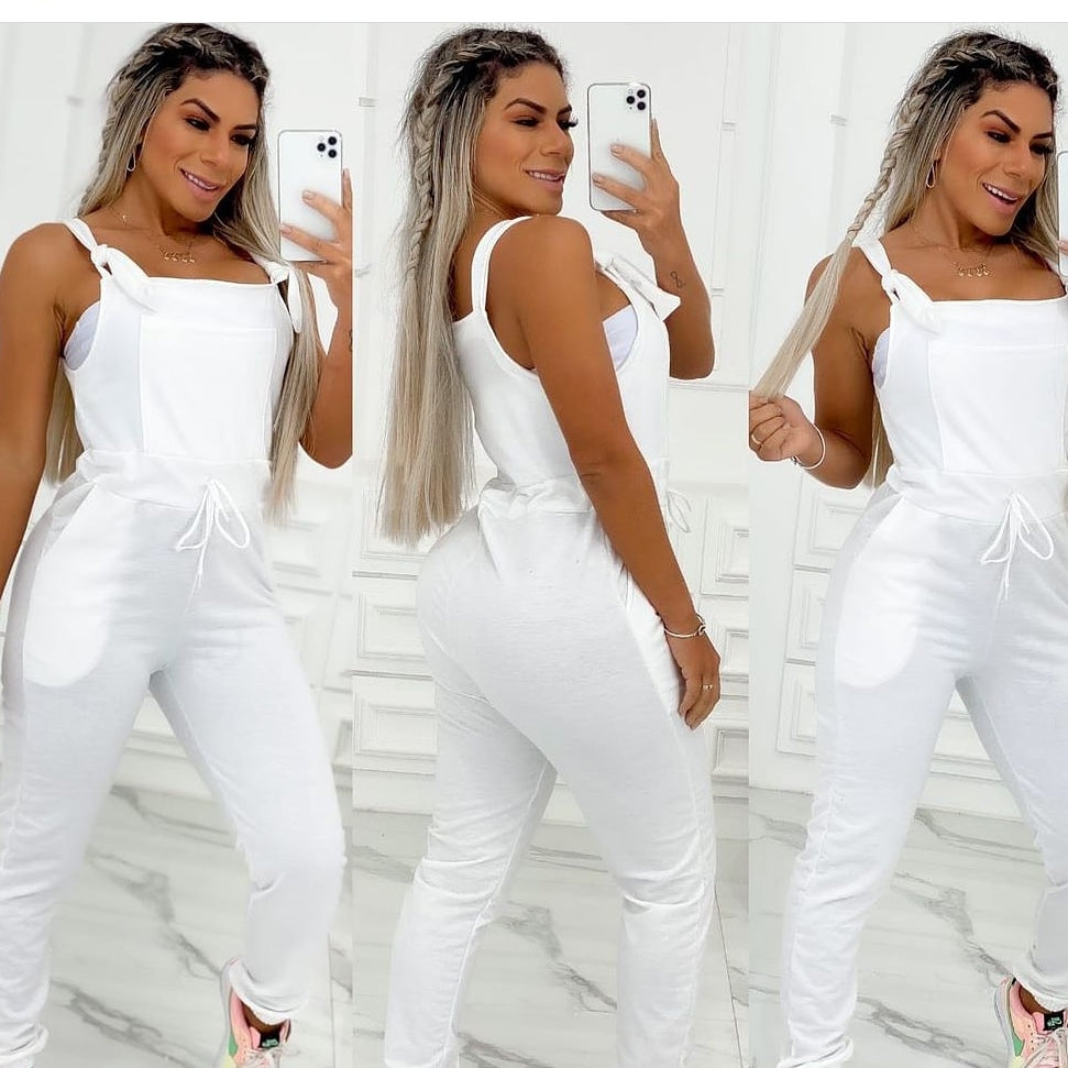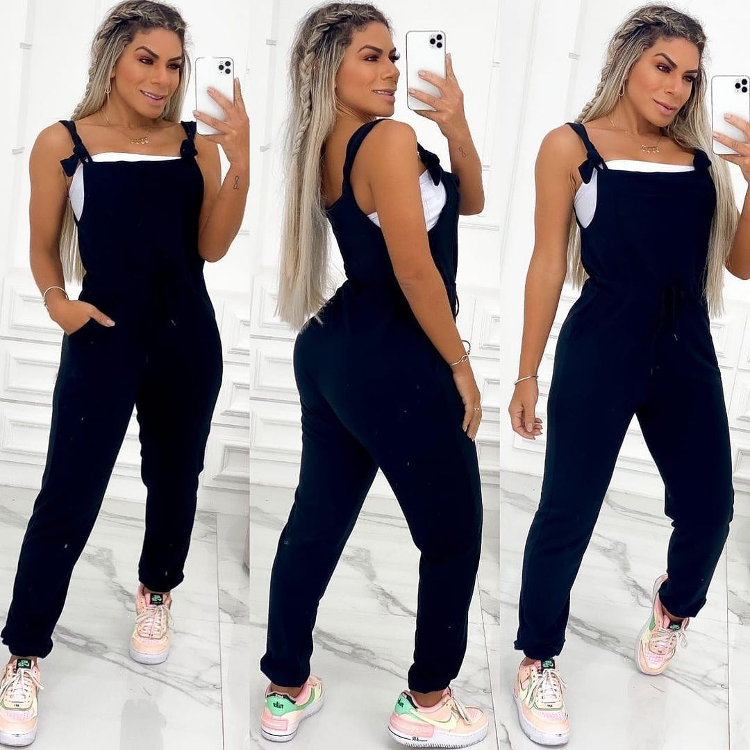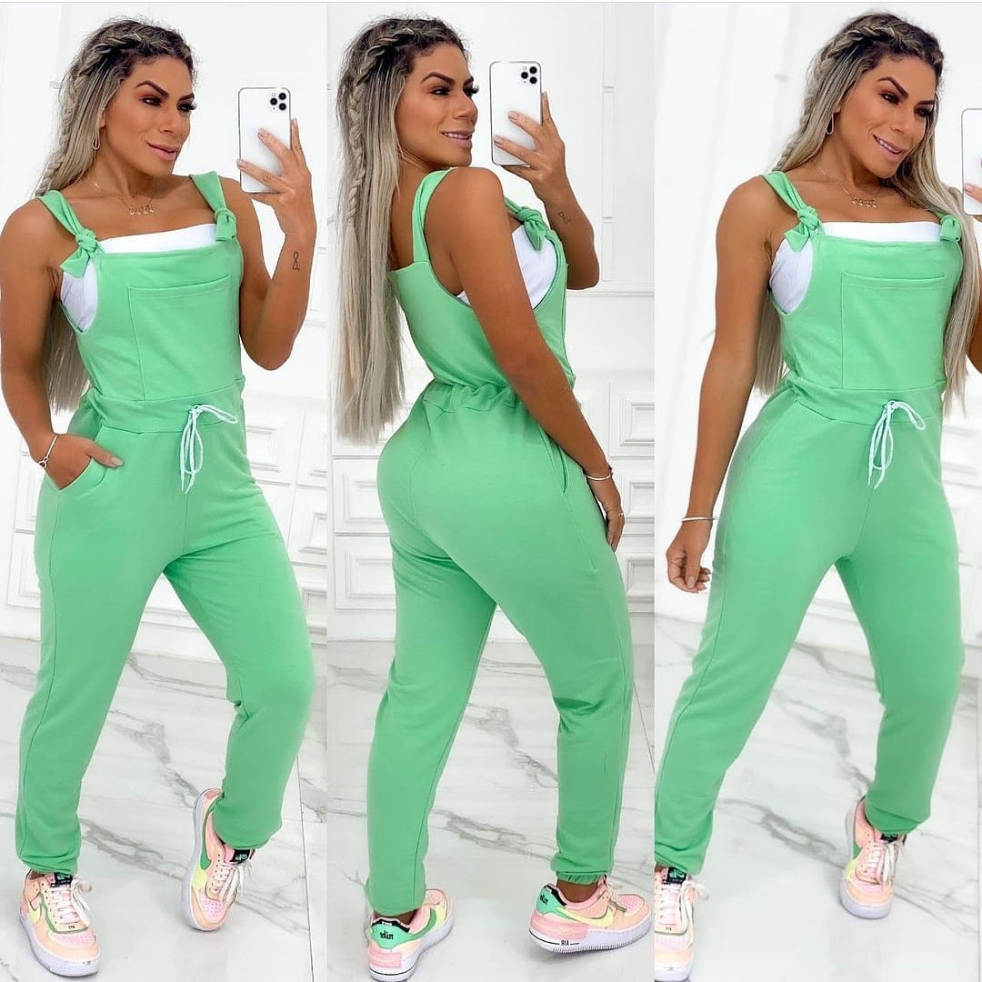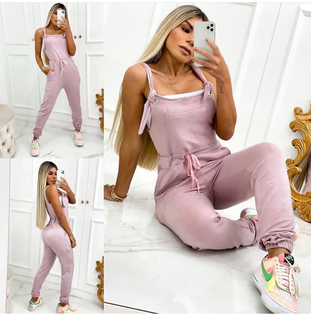 Jardineira em moletinho com bolsos laterias e amarração na cintura E alça regulável em amarração peça Versátil e descontraída . Ideal para você