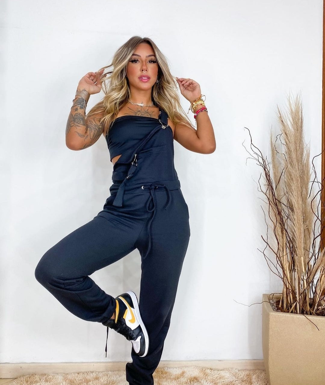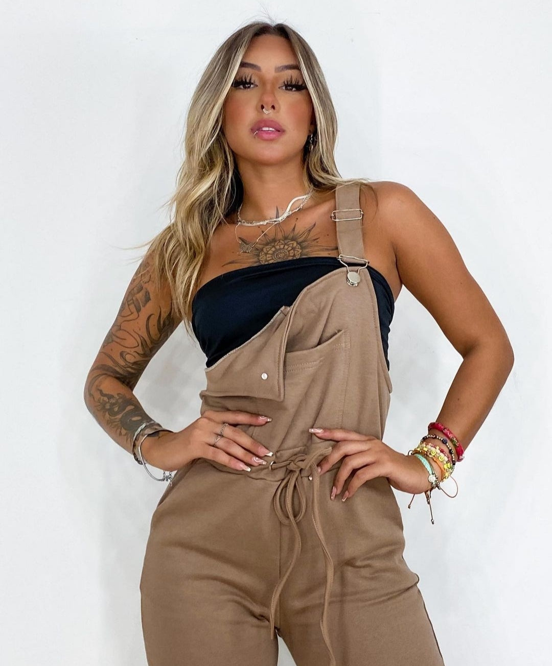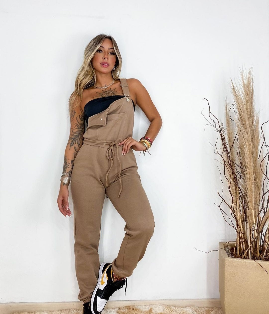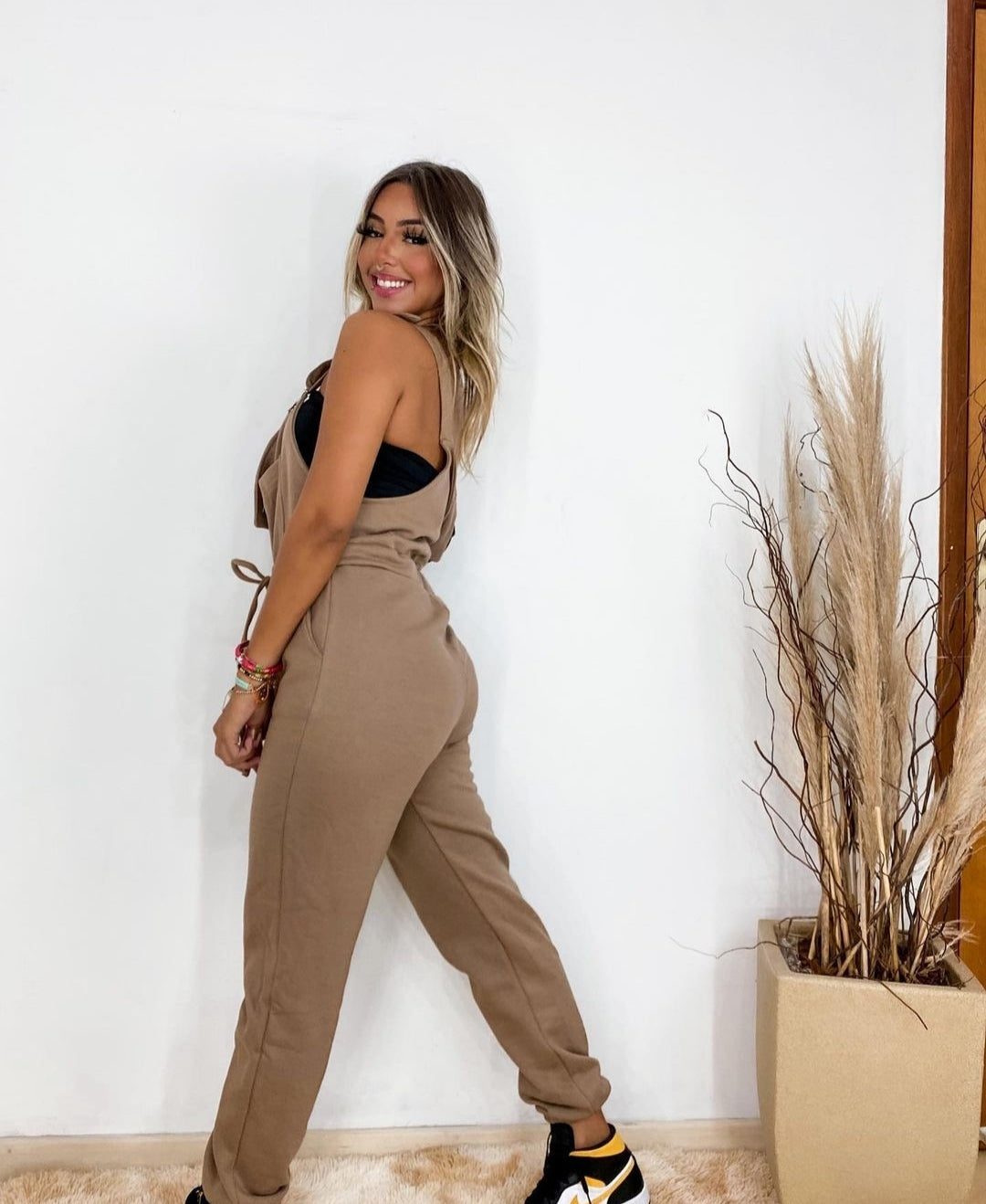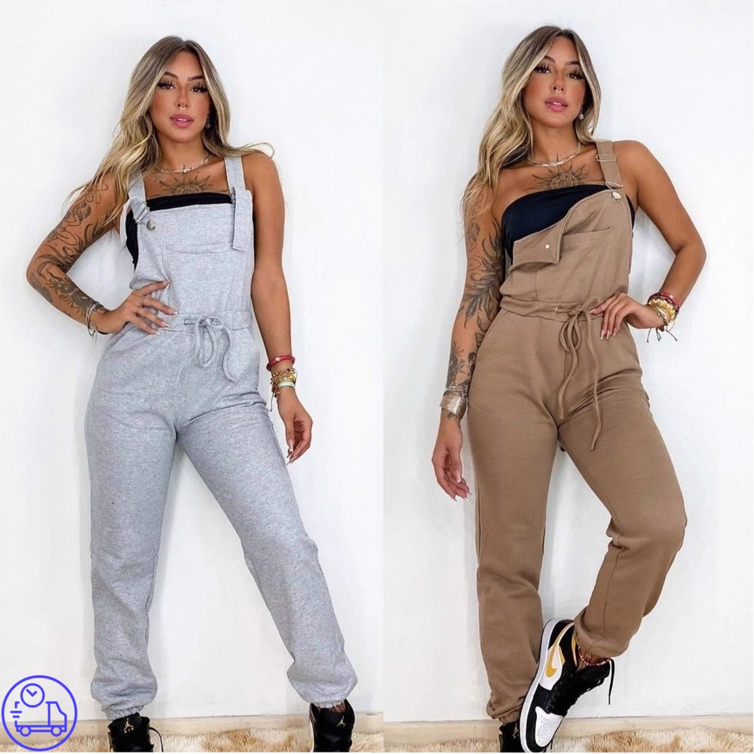 Jardineira em moletinho , tecido com elasticidade, bem confortável e caimento perfeito, alça com fecho , bolsos laterais e frontal e amarração na cintura . Modelo longo