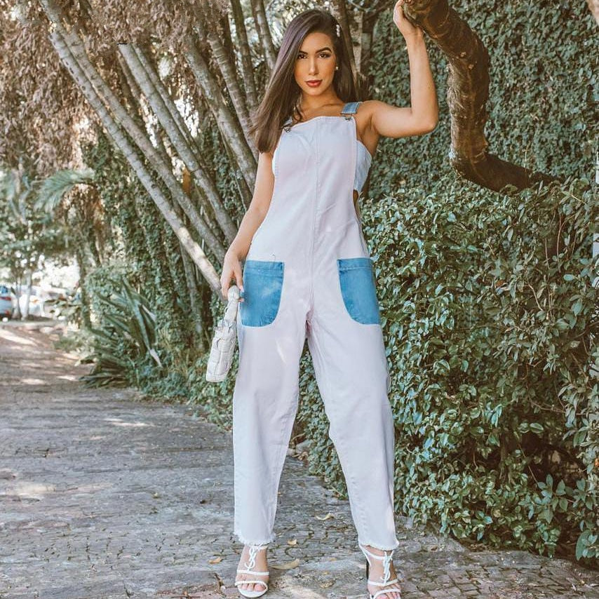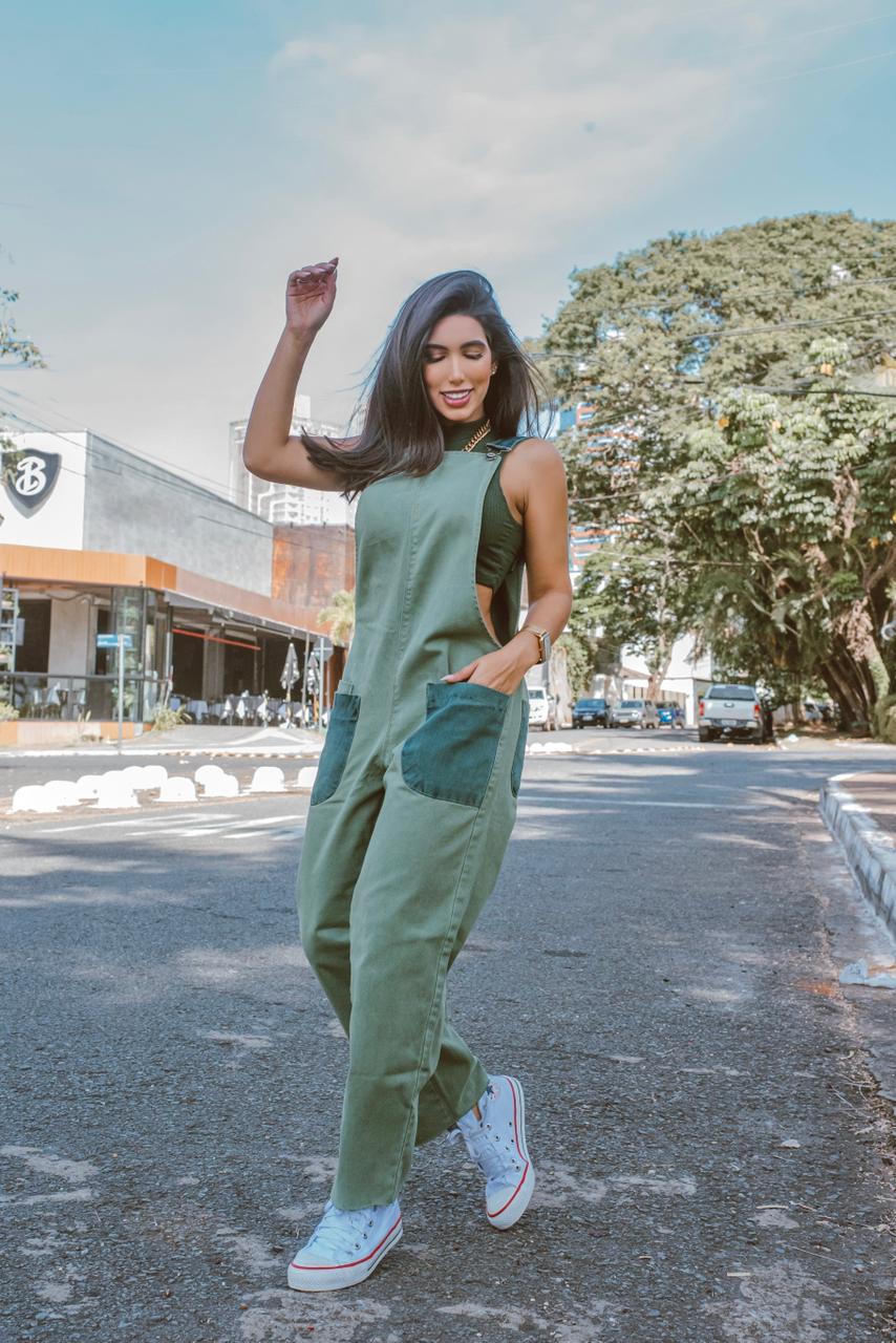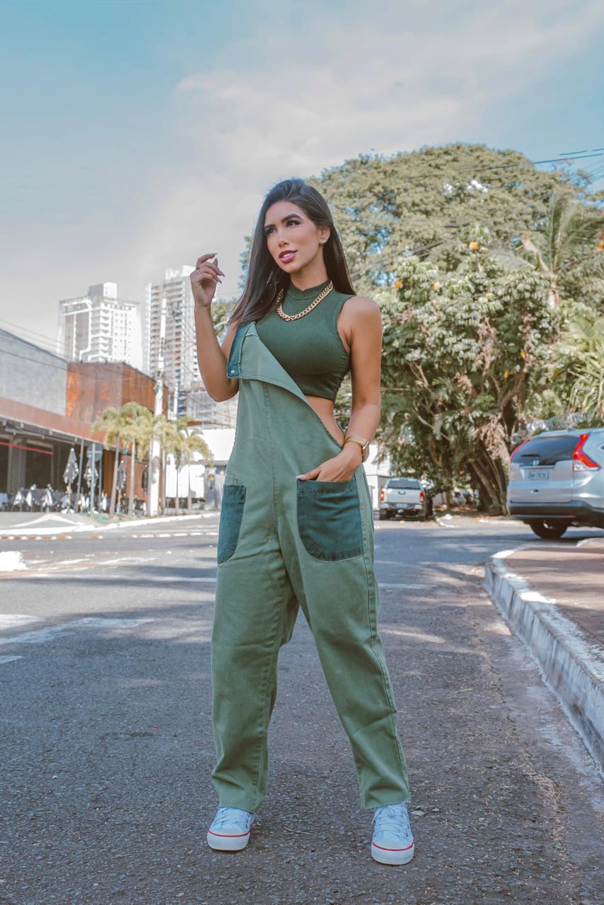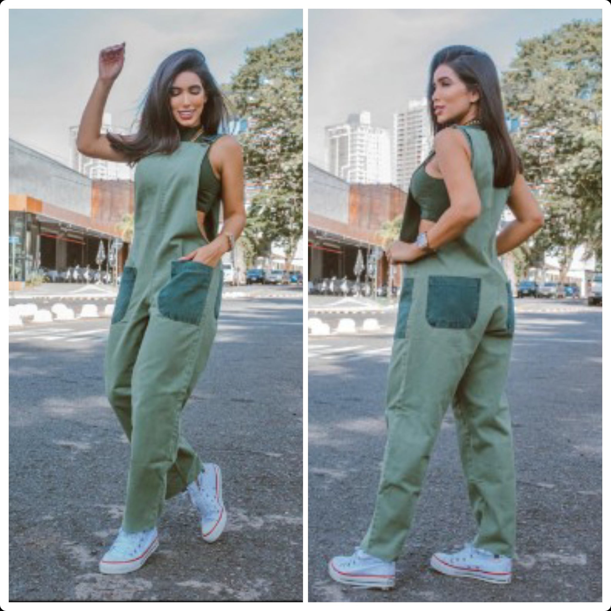 Jardineira em brim sem elastano com alça grossa superior com feixo regulável e bolsos customizados frontais e traseiros na tonalidade mais escura,.tecido de excente qualidade , maleável.