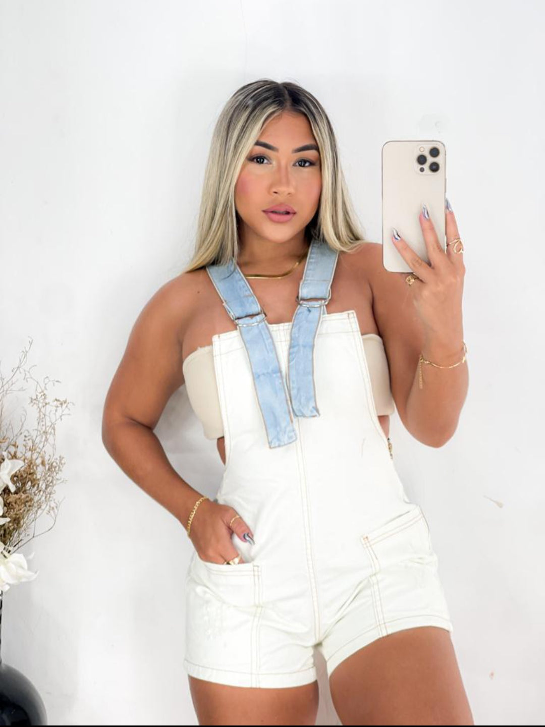 Jardineira jeans branca com detalhes em jeans mais escuro Na alça e bolos, sem elastano não estica , caimento leve e descontraído.