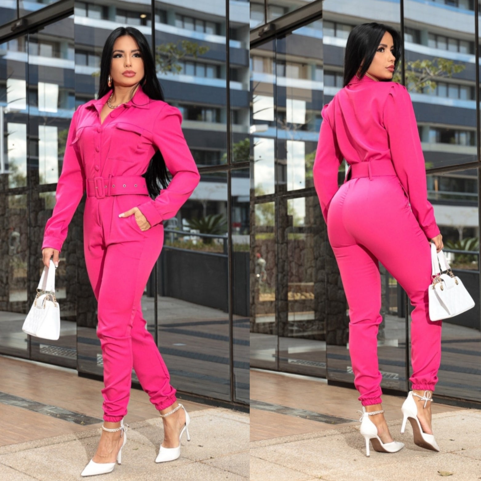 Macacão em alfaiataria, manga longa com botões de abertura frontal acompanha cinto forrado no mesmo tecido. Veste perfeitamente do 38 ao 44 não tem elastano.