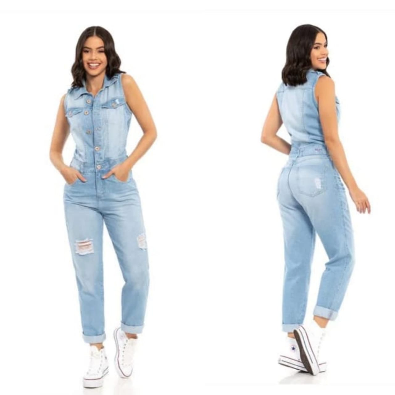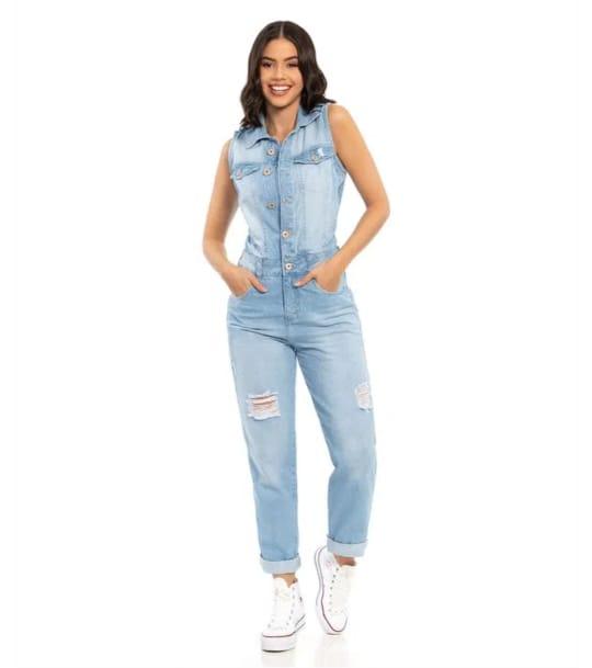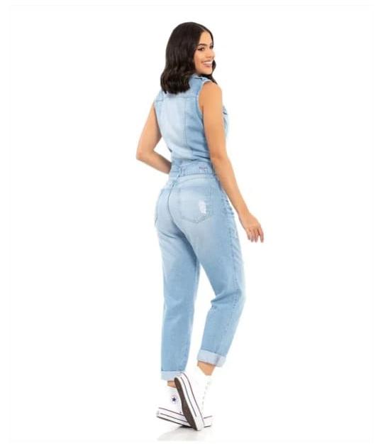 Macacão jeans feminino, feita em algodão, de lavagem clara com Ziper e botões frontais. Possui forro de bolso.