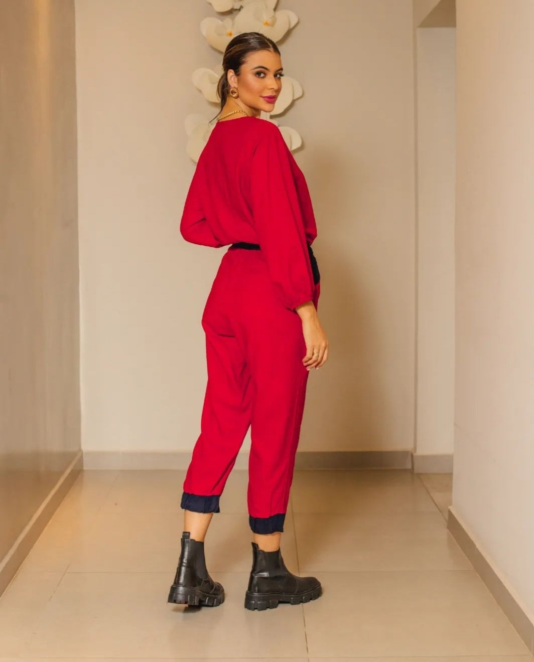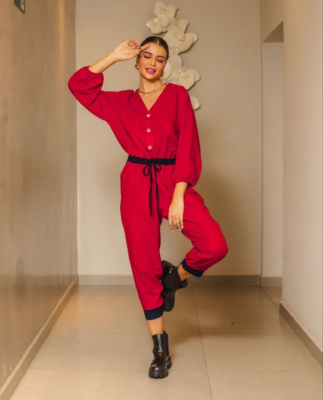 Macacão em linho com amarração na cintura , botões frontais e manga longa , tecido leve sem elastano com corte preciso , toque macio . Disponível do 38 ao 48