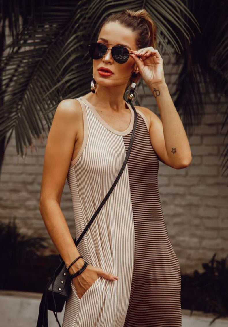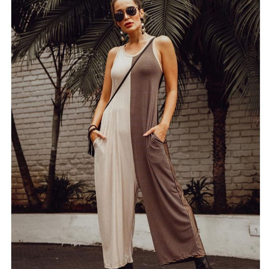 Macacão em viscolycra com destaque em blocos de cores bem despojado e moderno , modelo regata leve e confortável caimento perfeito com bolsos laterias .