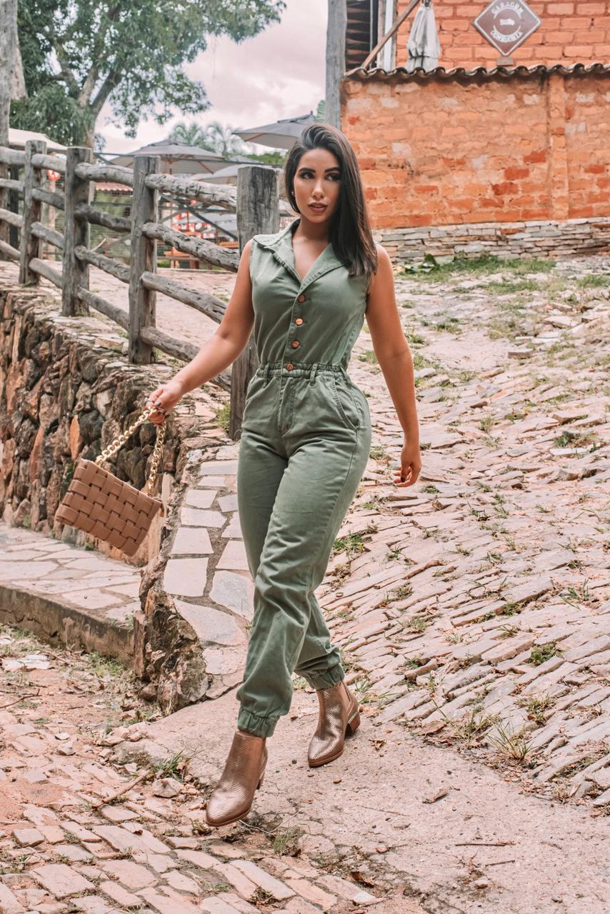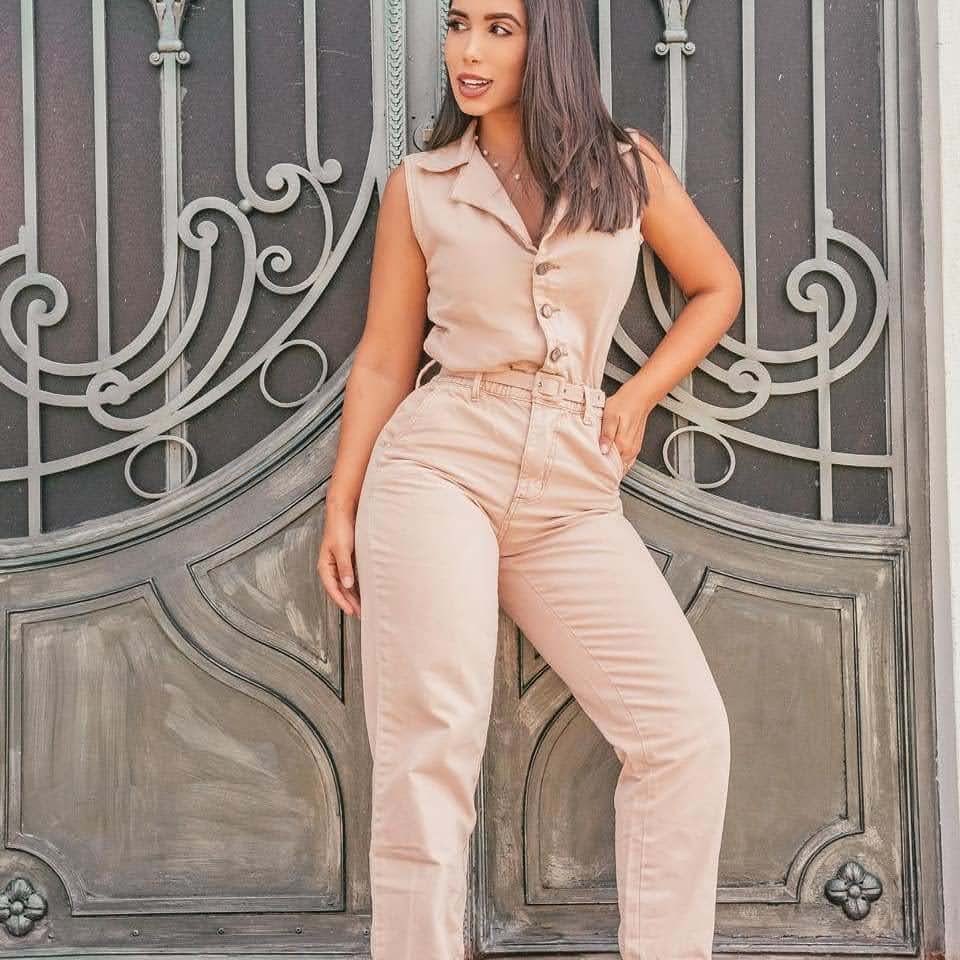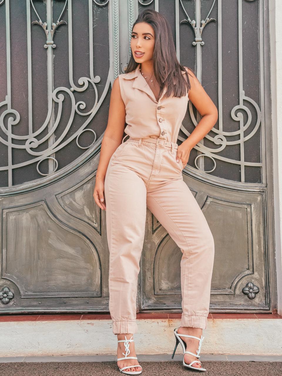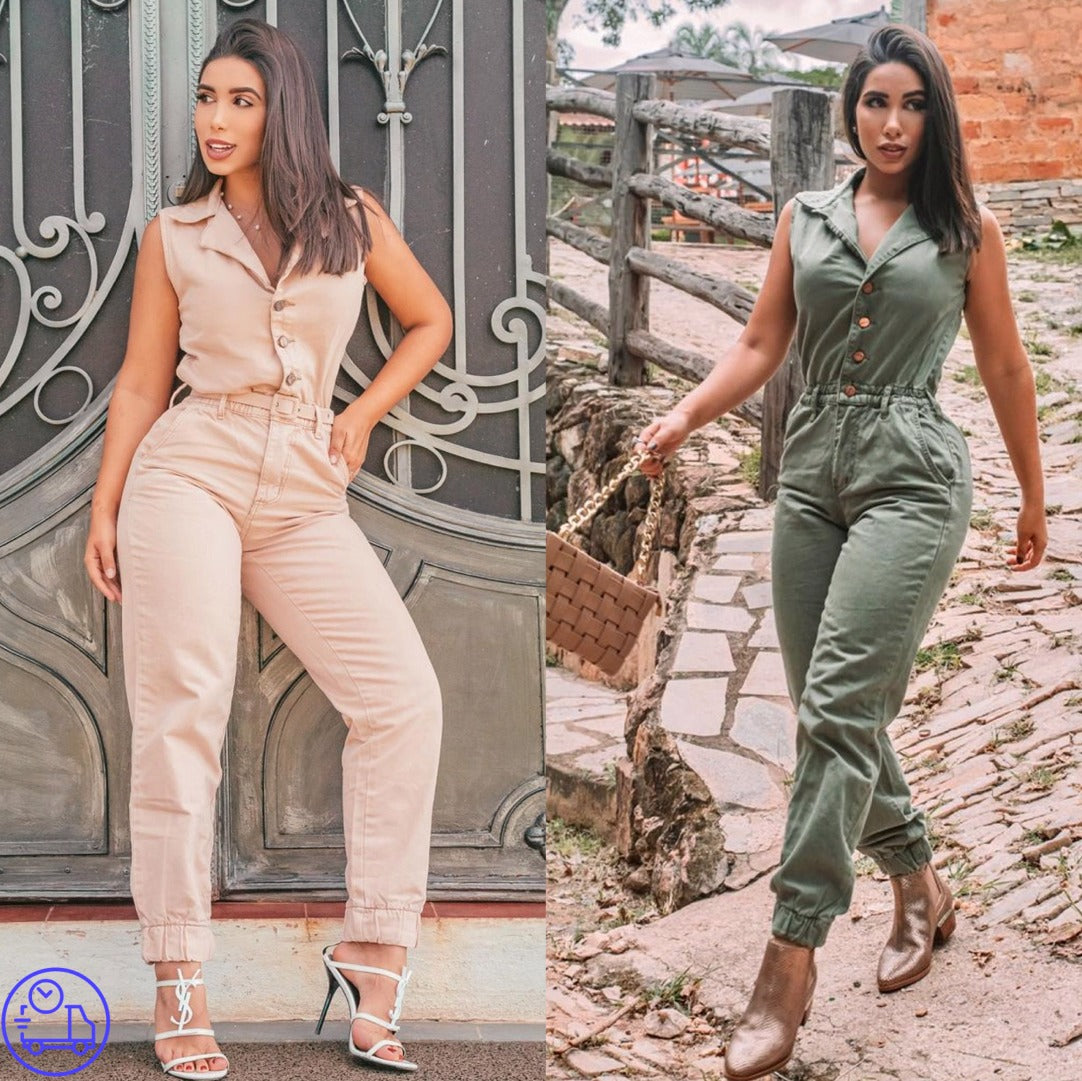Macacão em brim, sem elastano,  nas cores bege e verde militar, com botões para abertura frontal e elástico na cintura para maior modelagem , bolsos laterias , modelo regata com gola. Lindo e despojado