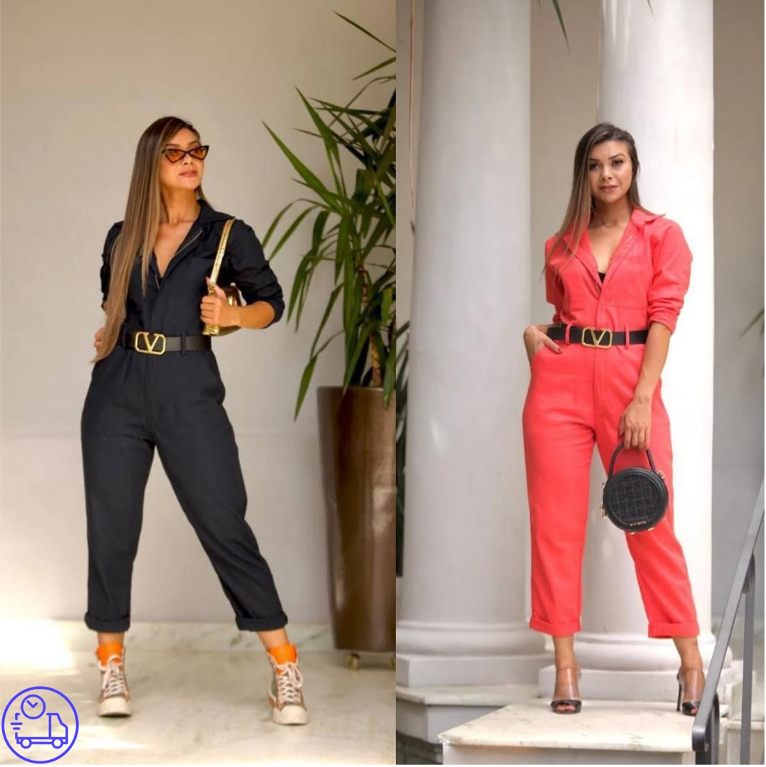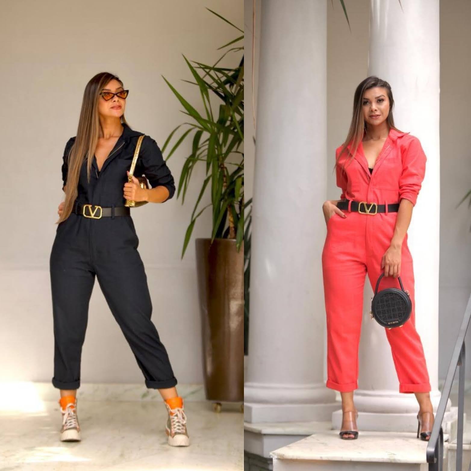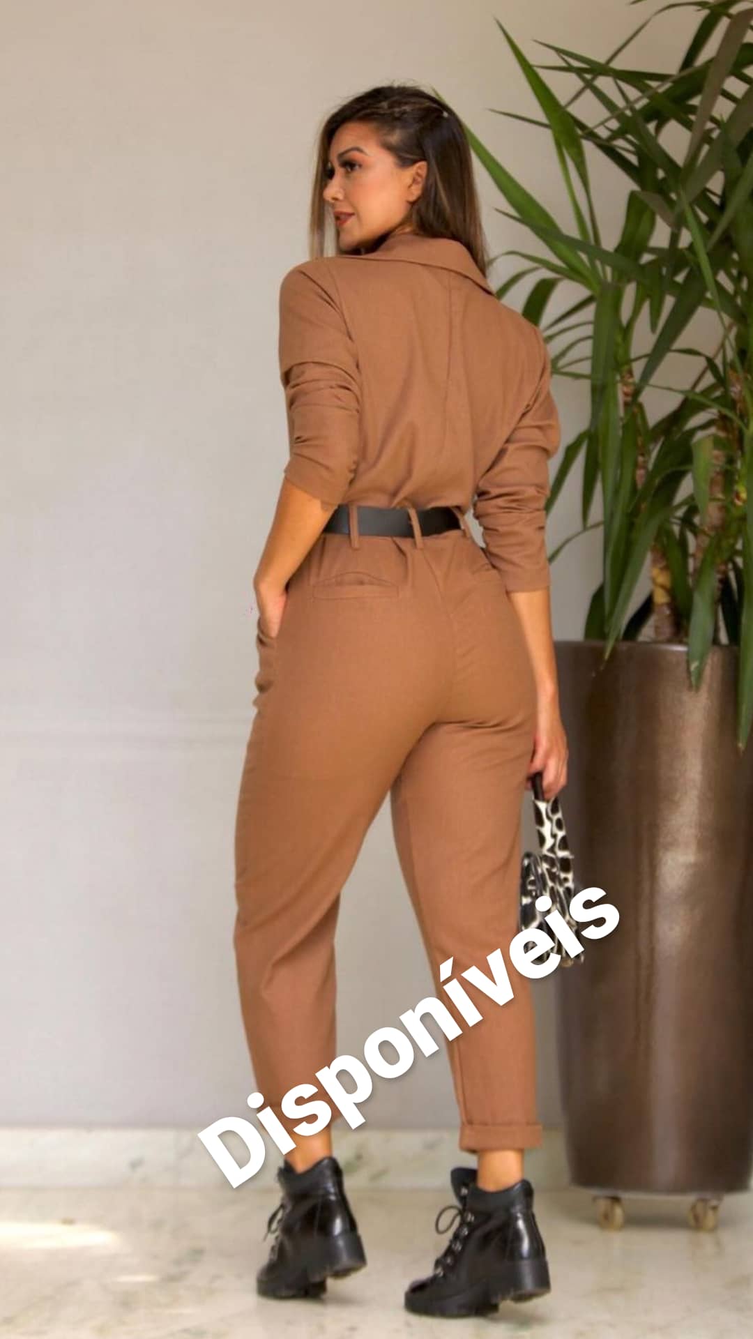 Macacão em linho com botões de abertura frontal, gola, manga 3/4 e bolsos laterais modelo Capri .