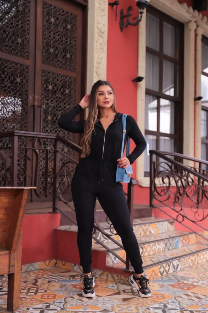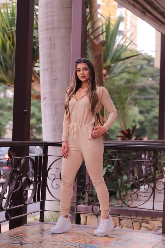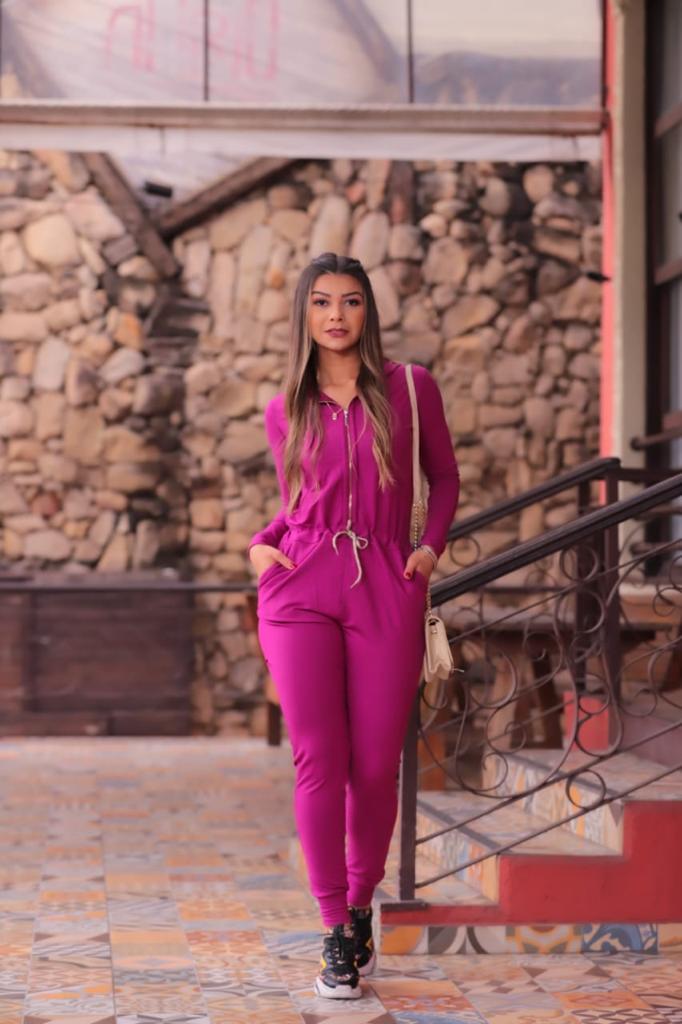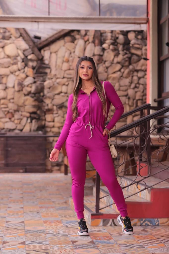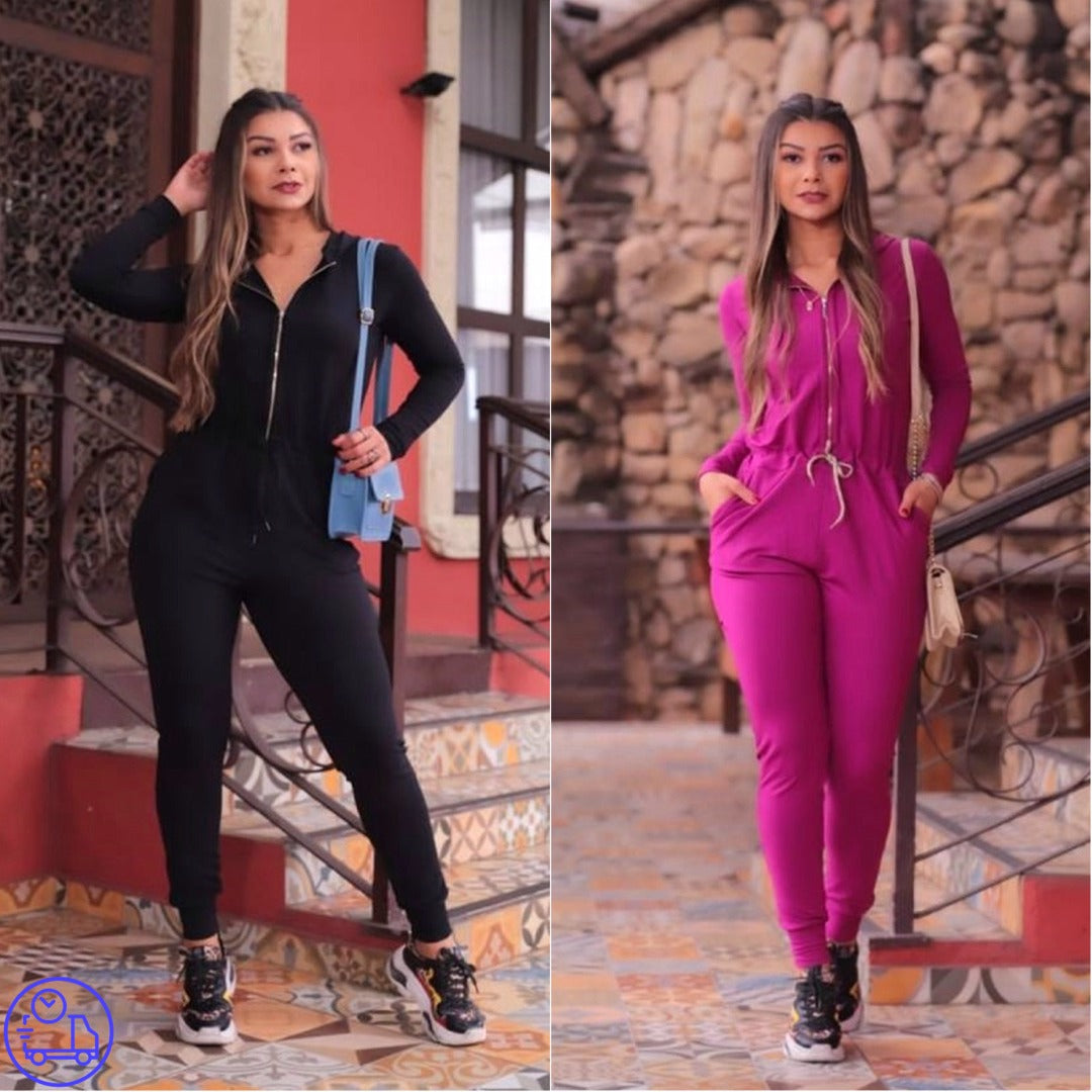 Macacão em moletinho tecido com elastano estica bem além de confortável e estiloso . Modelo manga longa de zíper frontal e cordão para amarração na cintura e capuz . Disponível do P ao G - Veste do 36 ao 46.