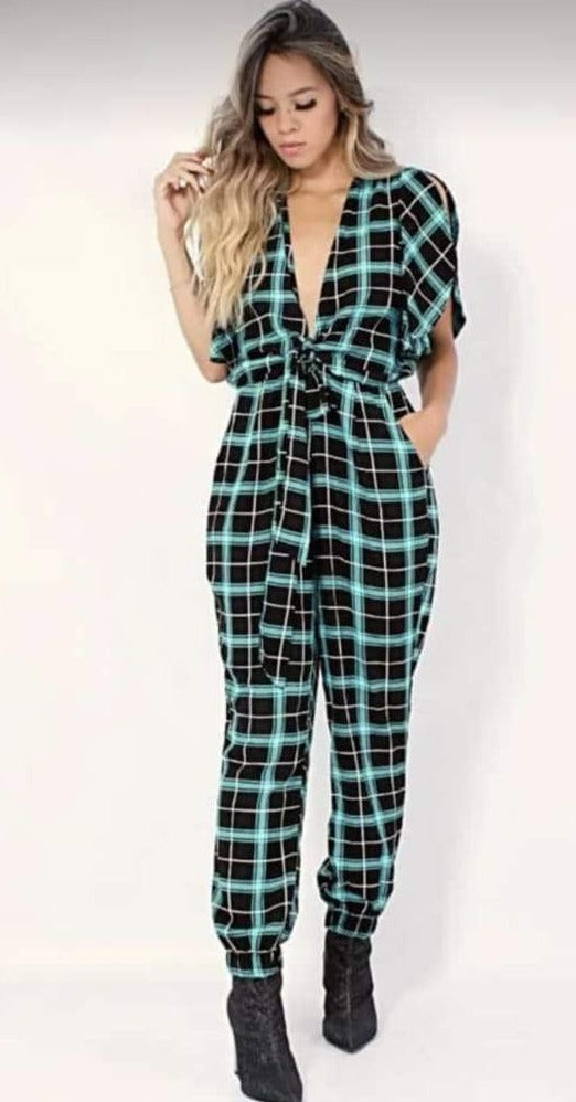 Macacão em viscose quadriculado, com bolsos laterais, manga 3/4 e cinto de amarração do mesmo tecido , no modelo quadriculado peça com estilo próprio