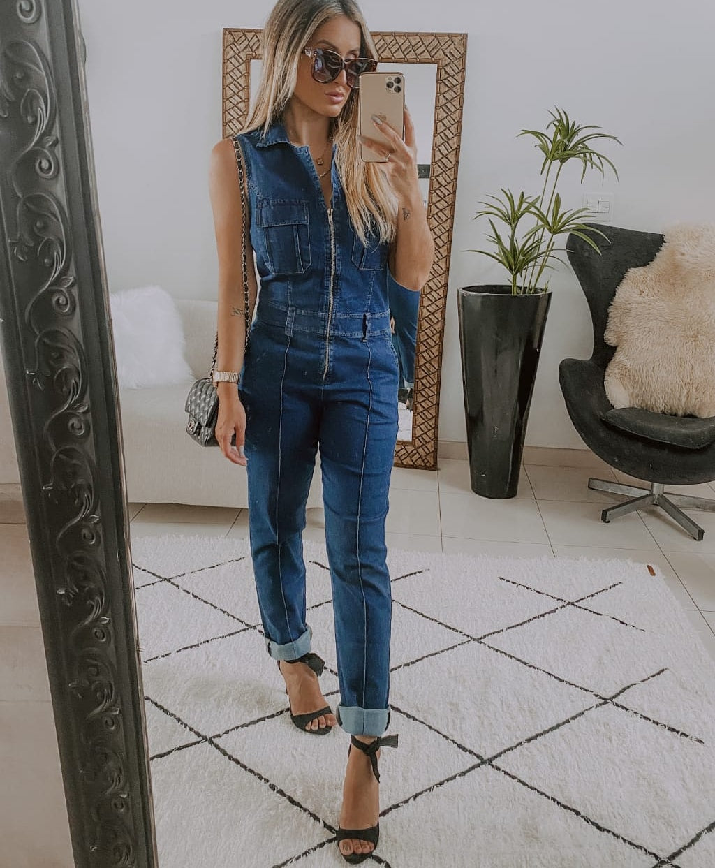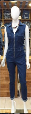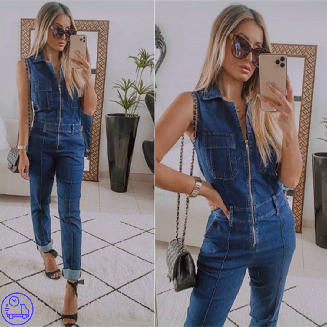 Macacão jeans com elastano regata com zíper frontal e golinha. Jeans de excelente qualidade, veste muito bem.