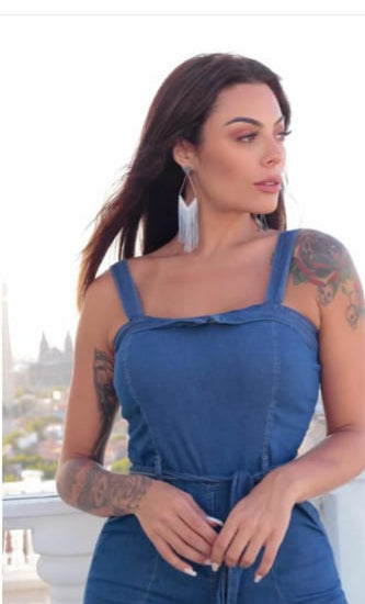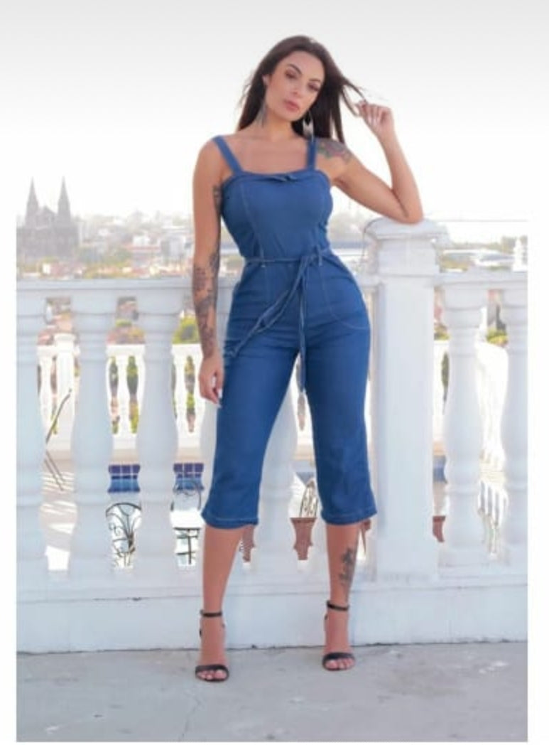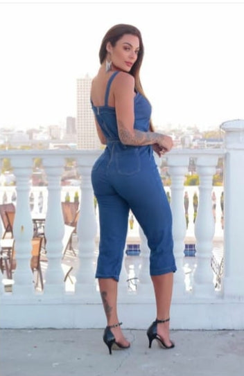 Macacão jeans com leve estano em alça larga para garantir maior sustentação no estilo pantacourt, ziper traseiro .
