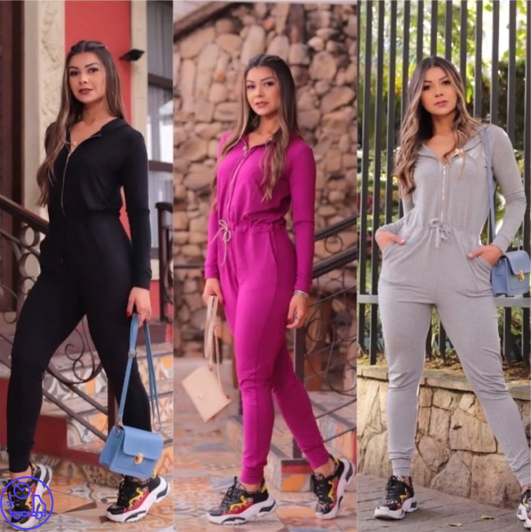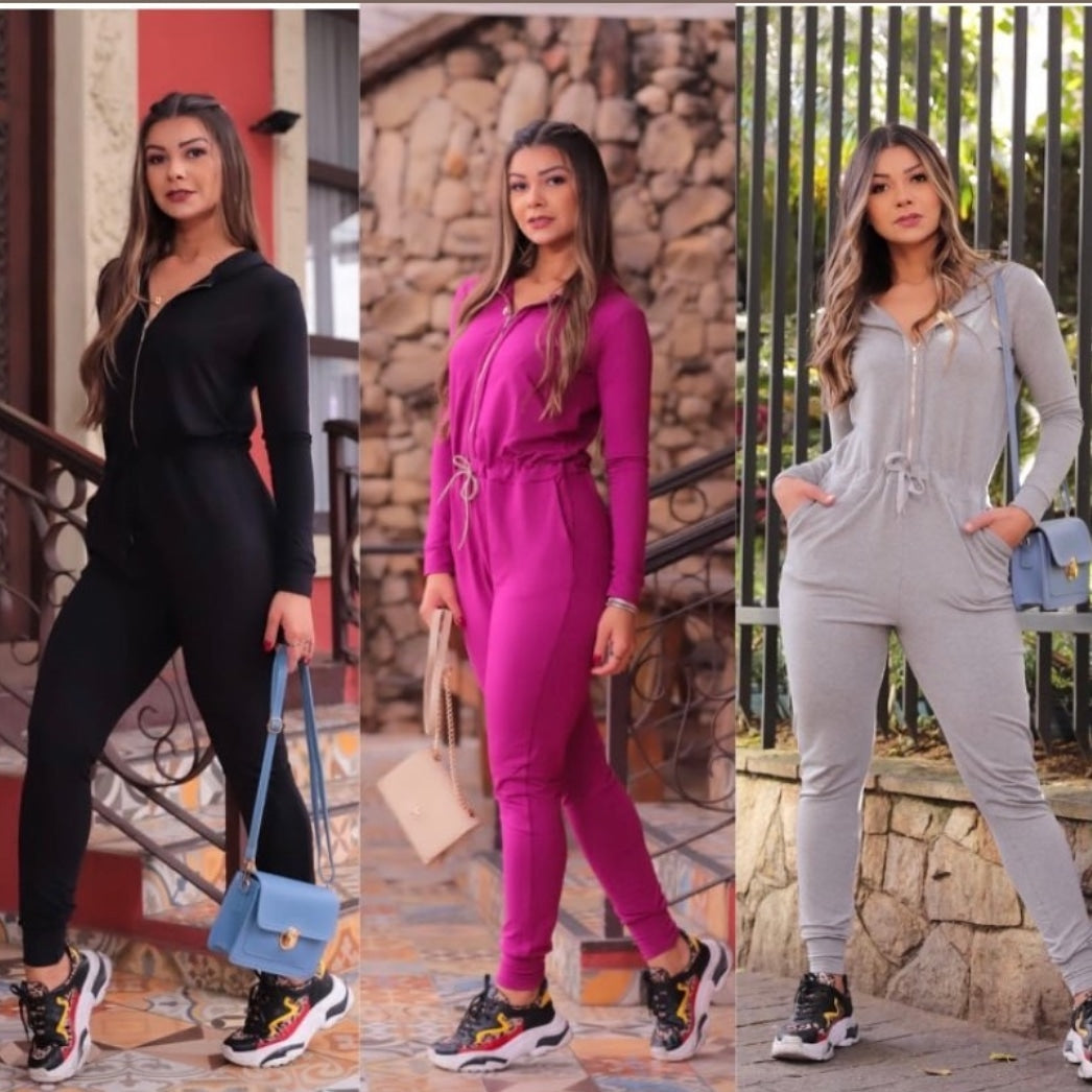 Macacão em moletinho manga longa com amarração na cintura, com zíper de abertura e bolsos  frontais, tecido com bastante elasticidade duplo de ótima qualidade. Disponível nos tamanhos P, M e G