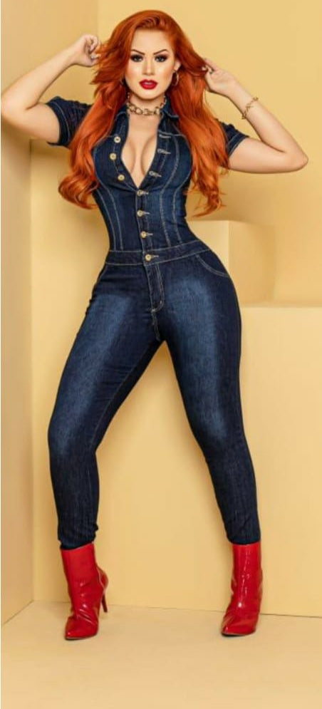 Macacão jeans com elastano na lavagem escura com botões frontais e manga curta , modelo skiny com bolsos traseiro, modela bem o corpo . Disposição nível do 36 ao 44