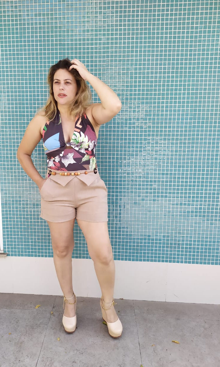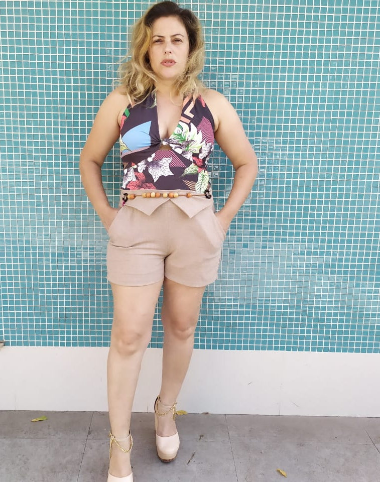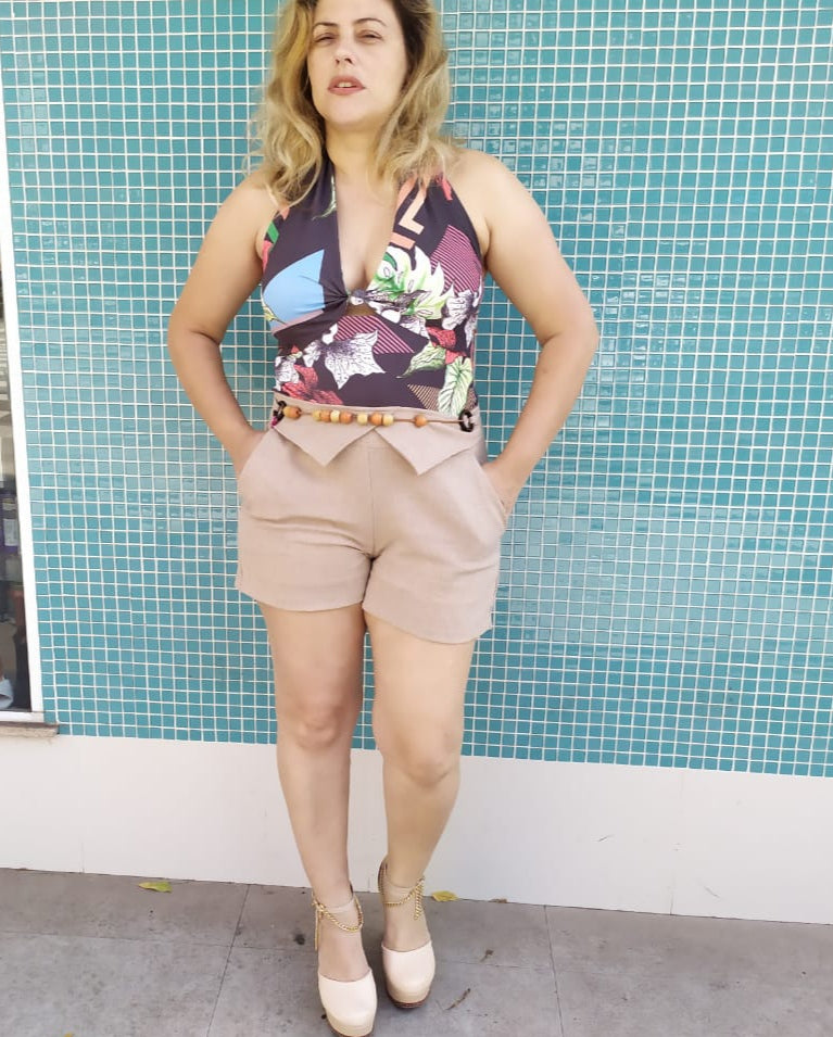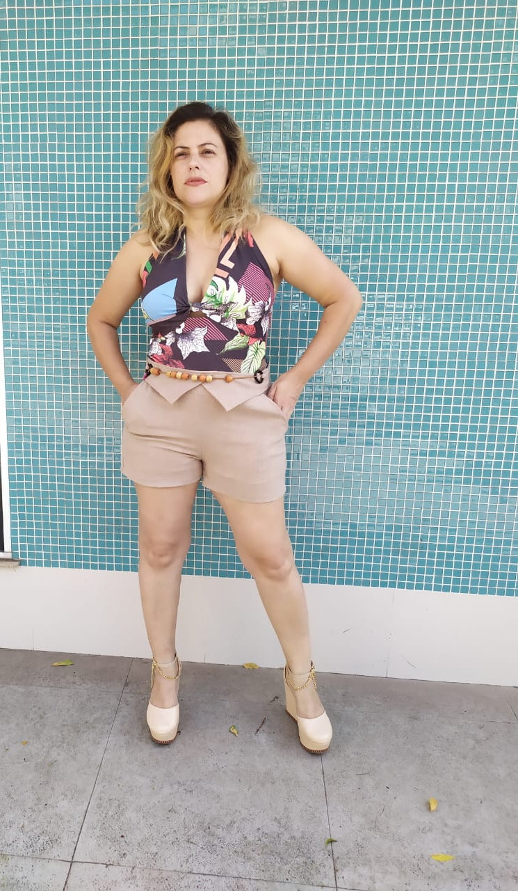 Macaquinho em Lycra com linho lindo e confortável no modelo frente única com detalhes no cinto de bolinha cinto fixo e bolsos laterais , tecido que estica bem. Parte superior estampada e inferior em cor lisa.