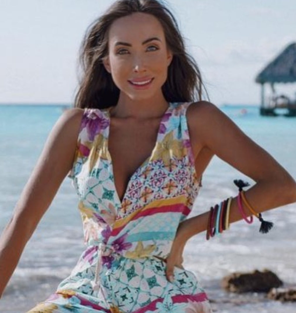 Macaquinho florido com abertura traseira, botão frontal estilo short-saia.