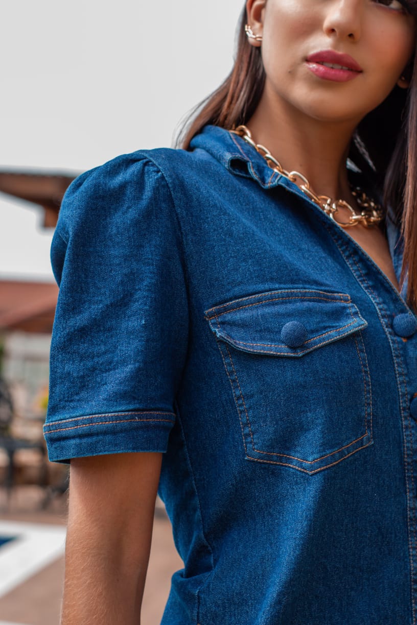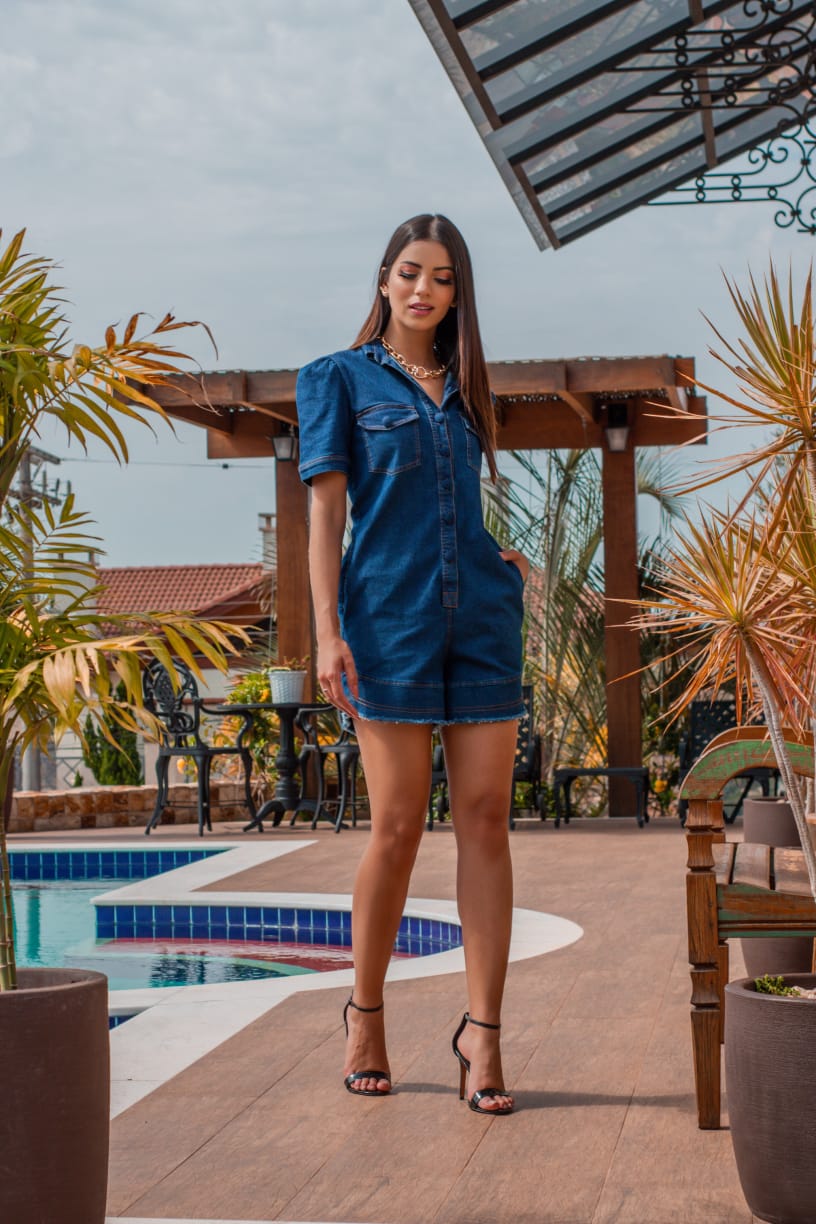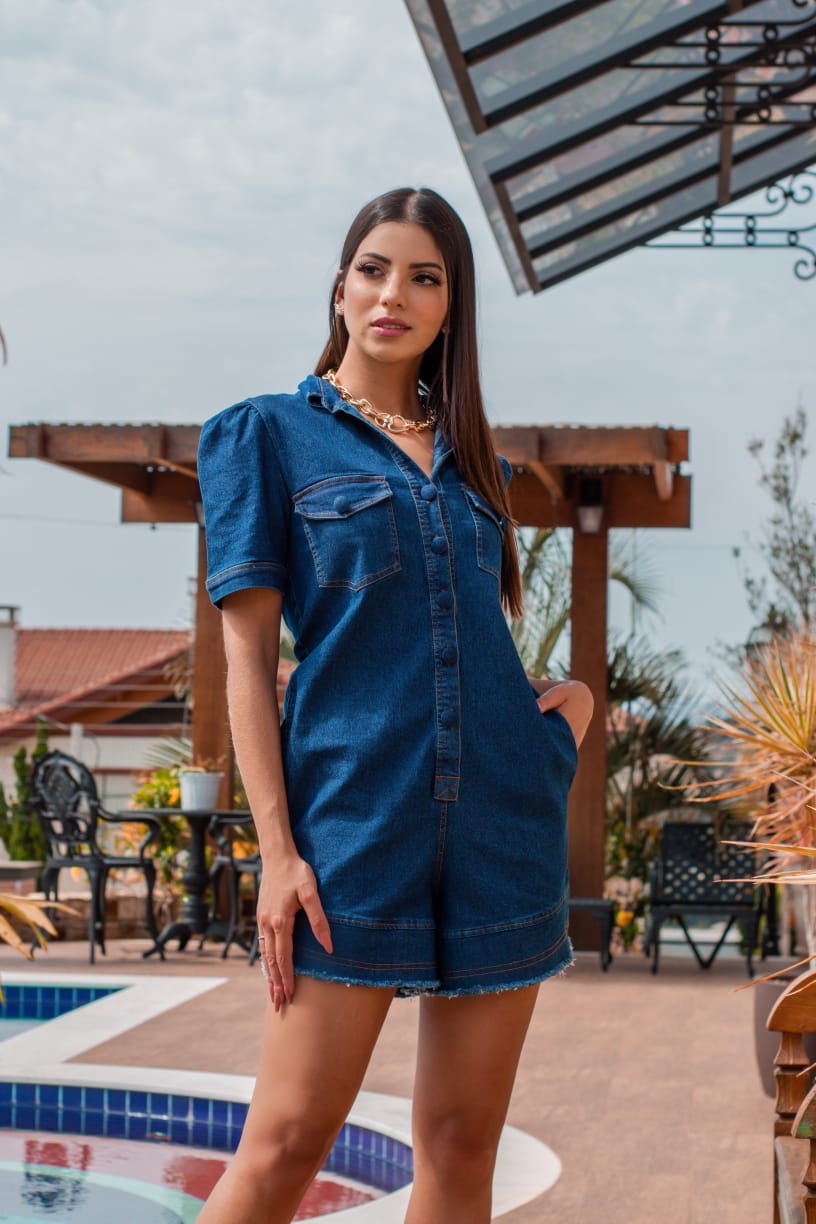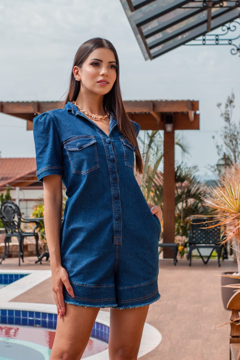 Macaquinho jeans 75% algodão/22% poliester/ 3%elastano com barra desfiada, manga princesa, costura externa , bolsos frontais e botões forrados. Simples , lindo e estiloso. Disponível do tamanho p ao gg