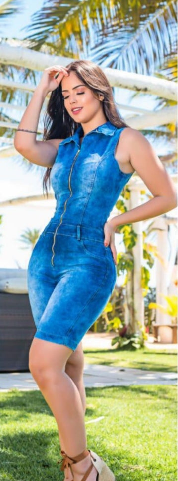 Macaquinho jeans com lycra destonado em bermuda, regata com ziper frontal e bolsos traseiro.