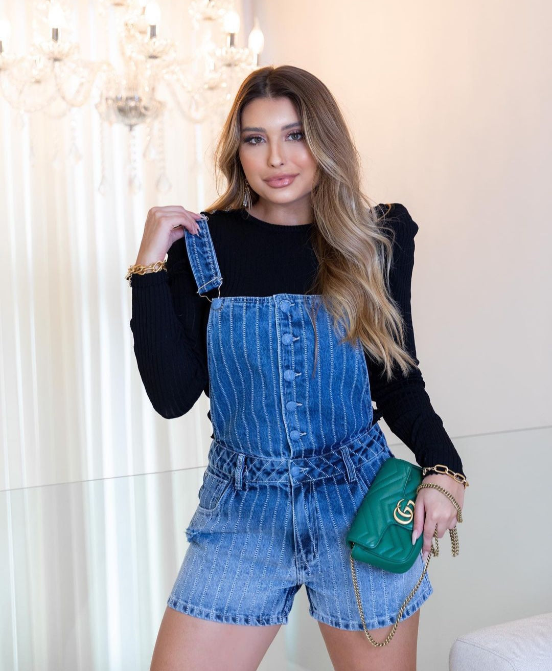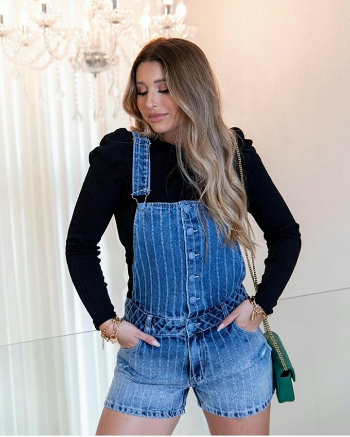 Macaquinho em jeans lavado sem elastano com padronagem risca de giz, bem moderno e despojado. Disponível do tamanho 36 ao 44