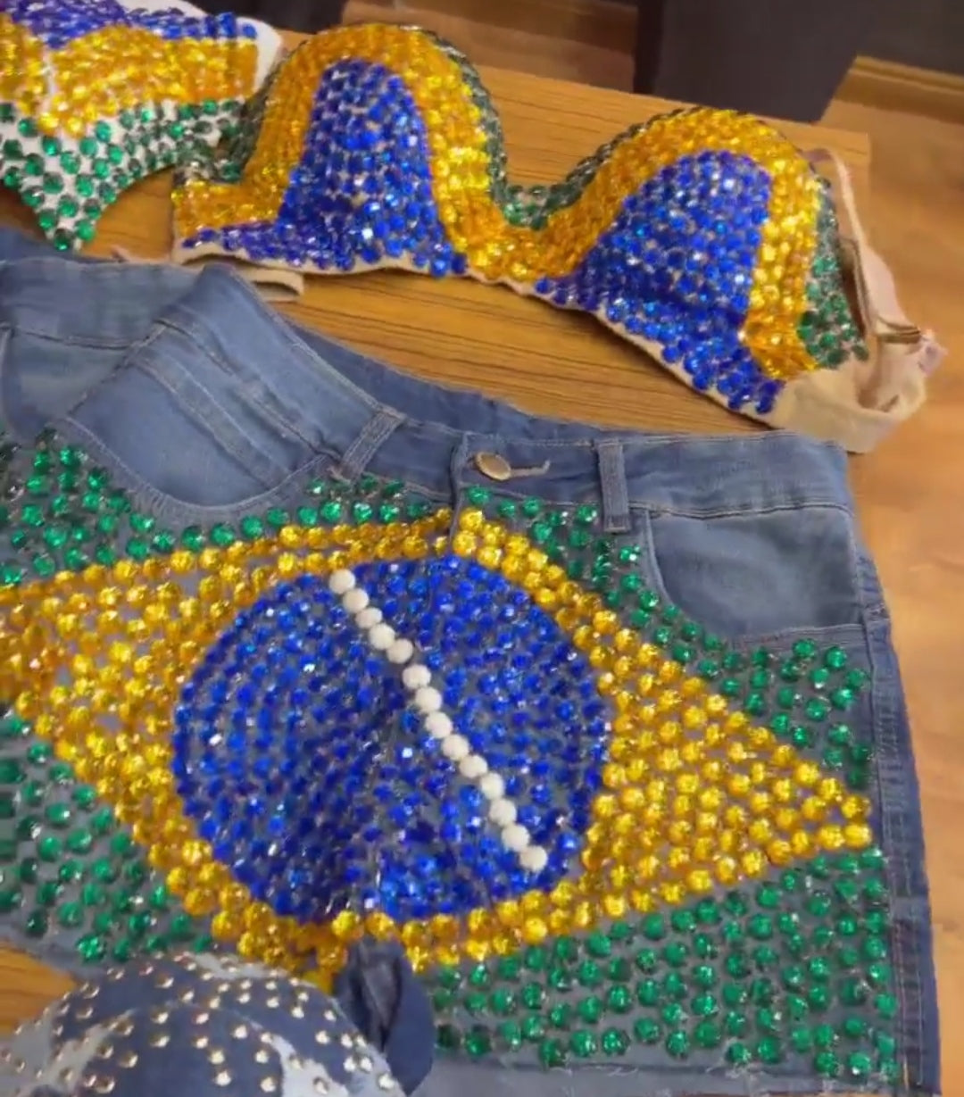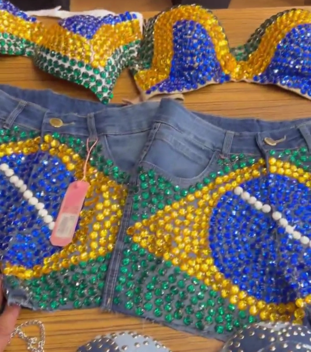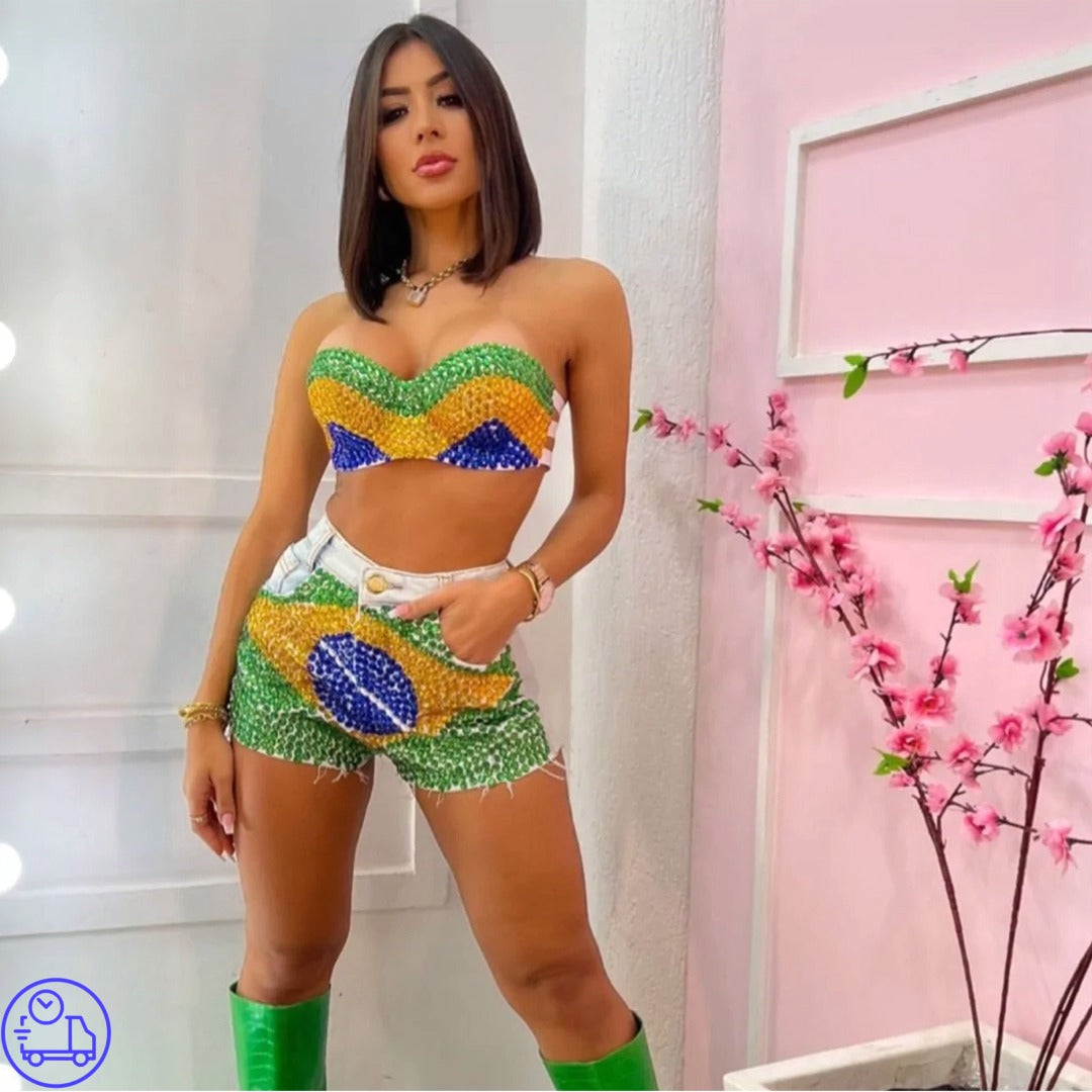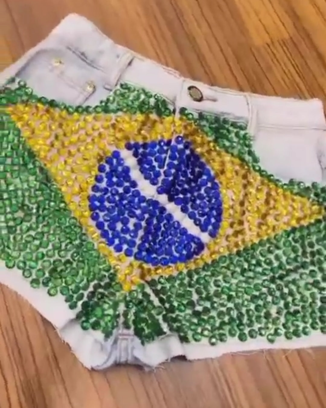 Shorts jeans bordado com pedrarias no formato da Bandeira do Brasil Peça diferenciada com muito estilo, forma tamanho normal disponível do 36 ao 44