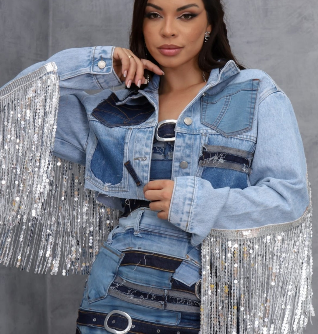 Vestido em jeans com Lycra , zíper traseiro , frontal customizada em jeans , modelo tubinho, não acompanha  jaqueta . Produto produzido por pedido com tempo para envio de 6dias úteis após a compra.