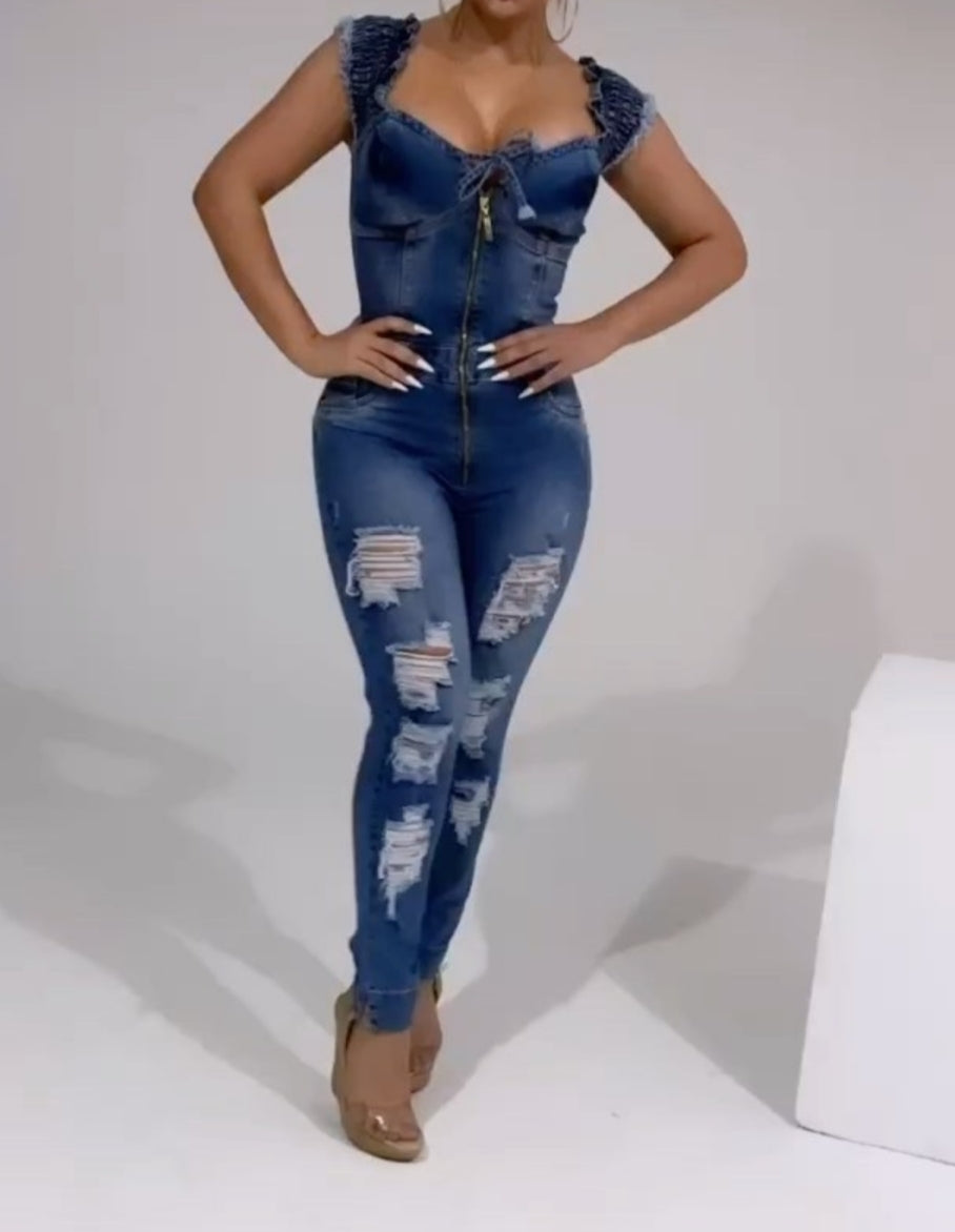 Macacão jeans customizado ombro a ombro com elastano power e zíper frontal.