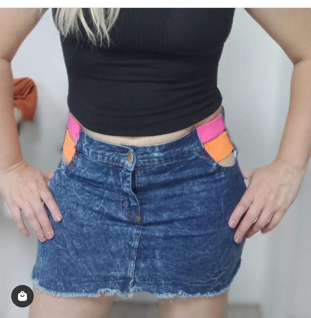 Mini saia em jeans com elastano está cá bem , customização em elástico nas cores do verão, com bolos traseiros , diferente e Modena . Ideal para o sei carnaval também