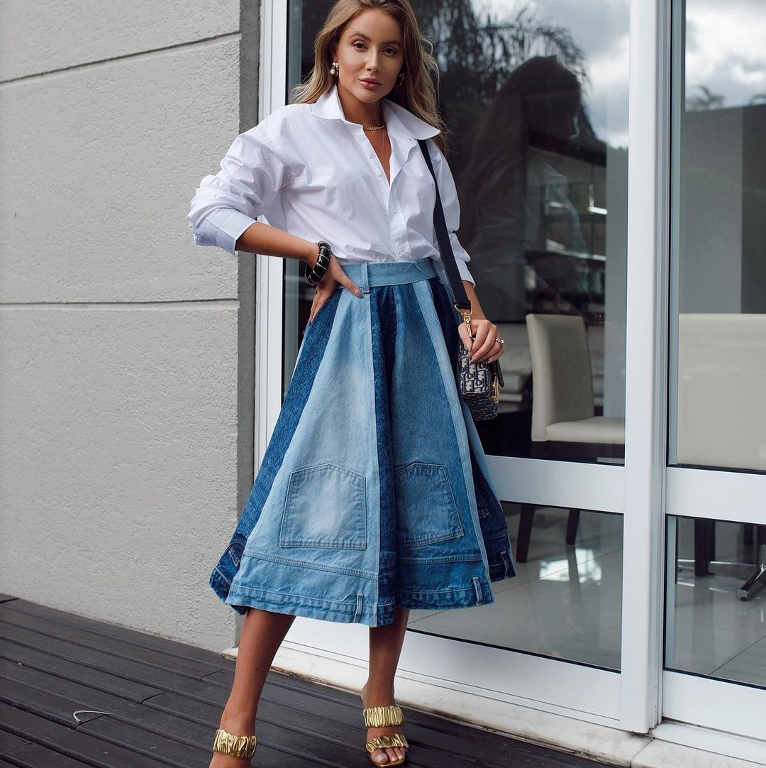 Saia jeans em camadas de jeans em tonalidades com sobre composição e detalhes de bolsos como em uma calça , tudo isso para que a sua peça seja única e inigualável.