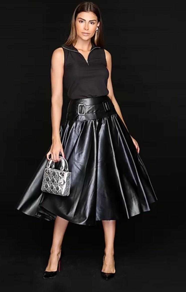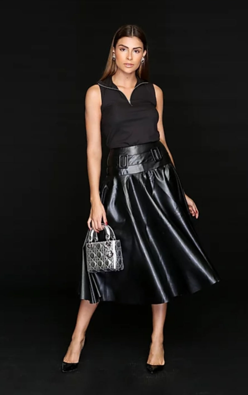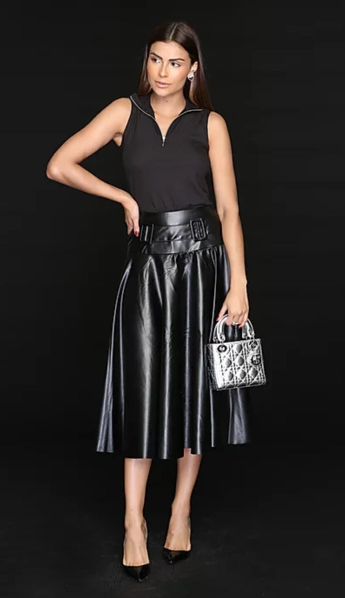Lindíssima saia em couro sintético preta brilhante, material de excelente qualidade com caimento leve. Além de moderno e fivela na cintura para uma modelagem melhor. Disponível no tamanho M (veste 40/42)
