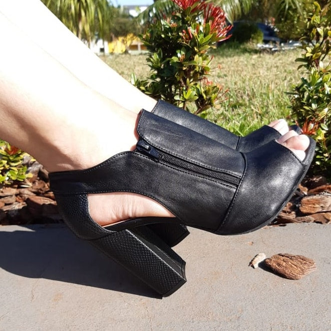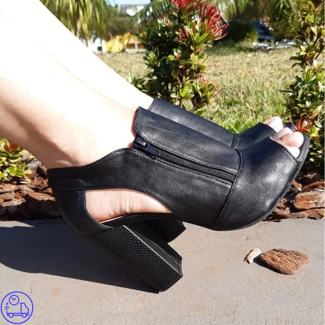Sandália no estilo botinha em courino com zíper e abertura leve lateral, salto quadrado com 8 cm, confortável e seguro. Material de excelente qualidade além de lindo. Disponível do tamanho 33 ao 39.