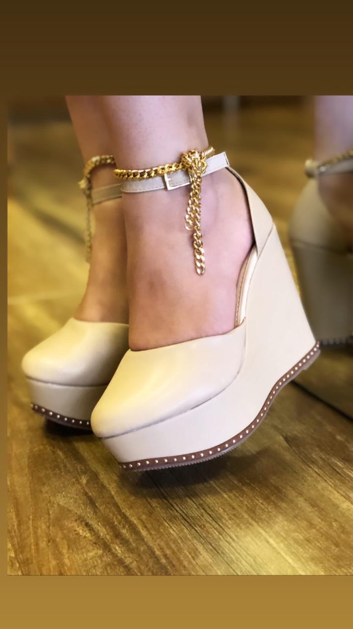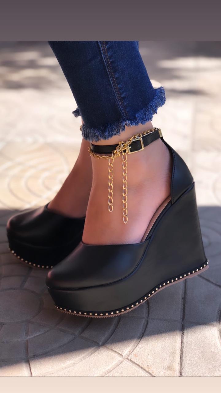 Sandália em PU forrada com feixo superior e correntinha que deixa a peça mais delicada e feminina , solado com detalhe com corrente. Parte frontal fechada que combina com todas as estacoes do ano.