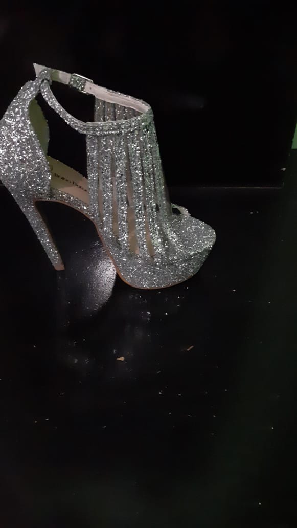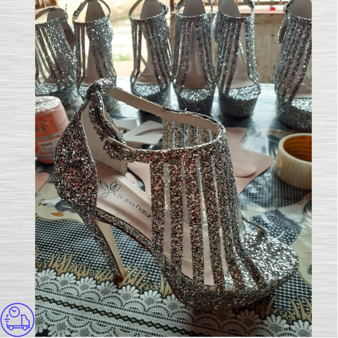 Sandália com salto 15 cm toda trabalhada em Glitter prateado forrada internamente com tiras que permite maior segurança aos pés. Disponível do tamanho 34 ao 38