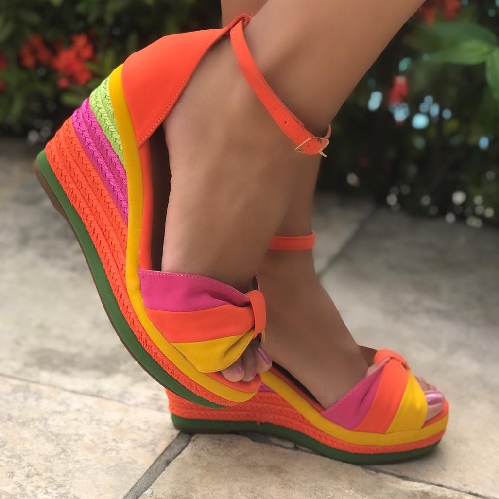Sandália plataforma 8cm aveludada com tira de apoio traseiro e solado emborrachado forrado de cortiça colorida, todo revestido internamente para proporcionar maior conforto e leveza . Forma grande