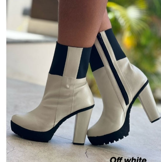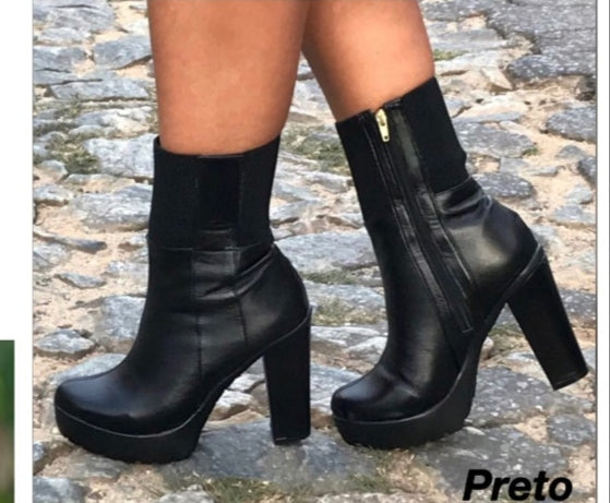 Bota em couro com elástico grosso na parte superior que ajusta melhor na perna , salto meia para frontal  3cm e traseiro 10 cm . Acabamento costurado e zíper para abertura lateral . Muito leve e confortável, encaixe perfeito nos pés . Extrema qualidade