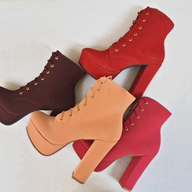 Bota cano curto em camurça resistente modelos meia pata que permite maior estabilidade E conforto salto bloco com 6 cm de de circunferência,e 10 cm de altura Traseira e altura frontal de 5 cm , cadarço para amarração frontal e zíper para abertura lateral. Um verdadeiro luxo