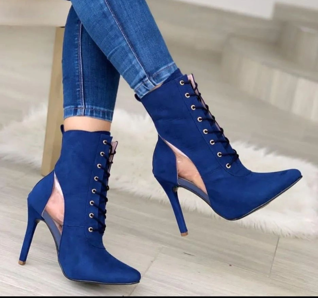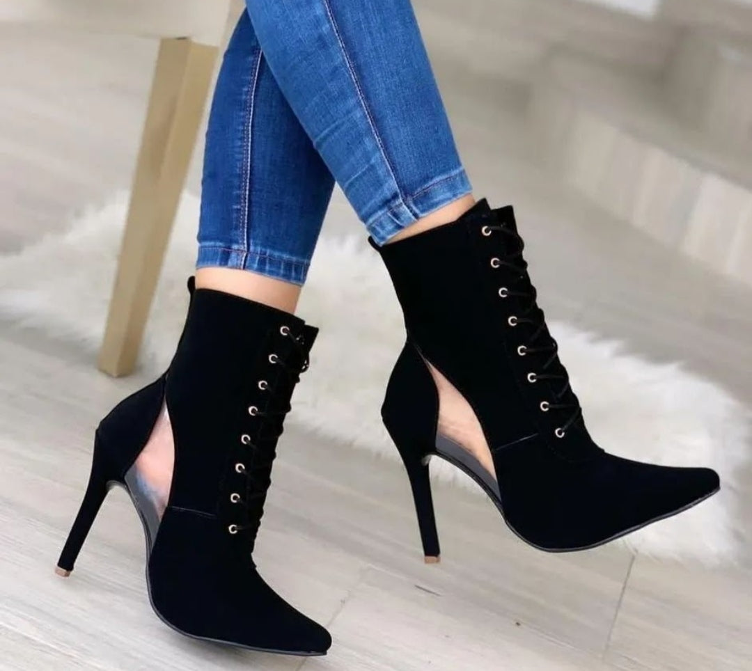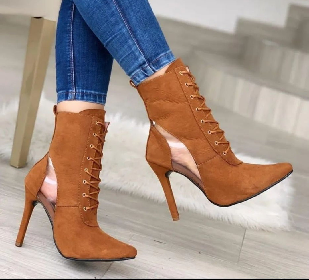 Bota cano médio com detalhe vazado na parte de baixo próximo ao salto material nobuck , um designer diferenciado a elegante , salto fino 12 cm com cadarço para amarração na parte superior, bico fino