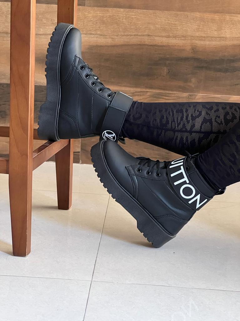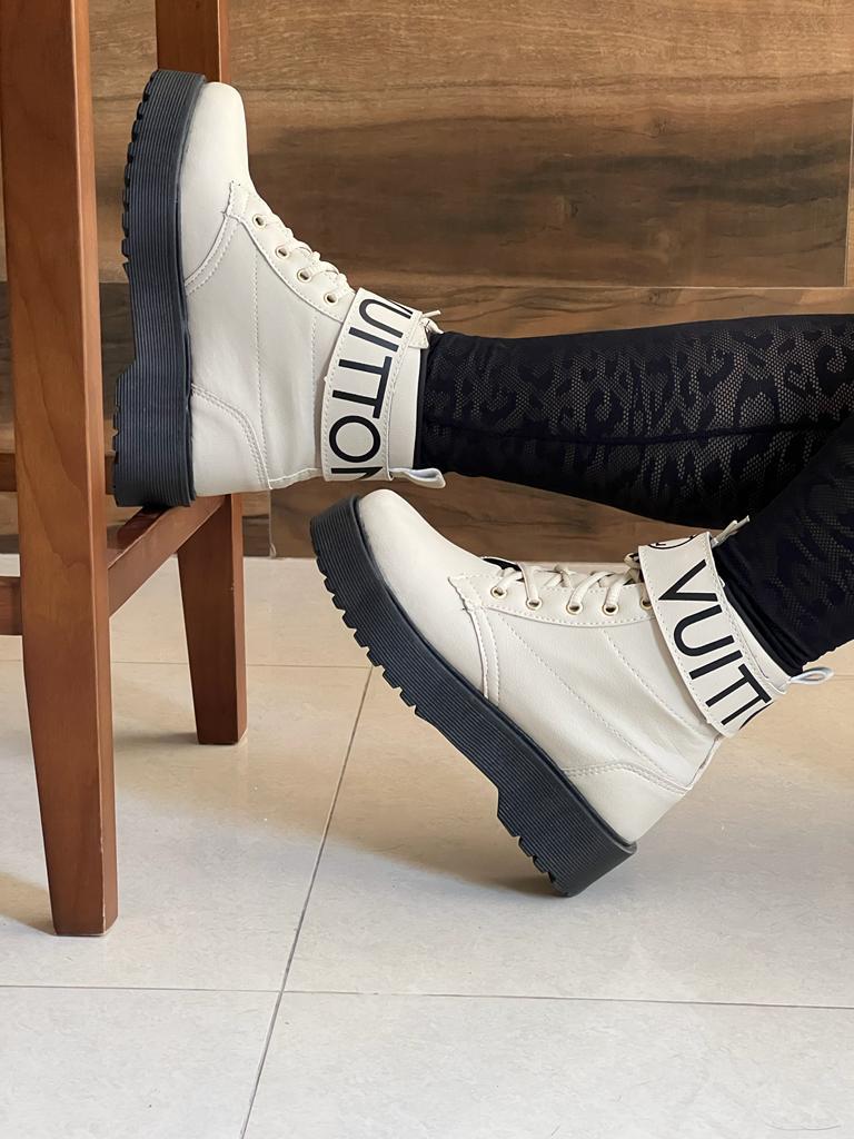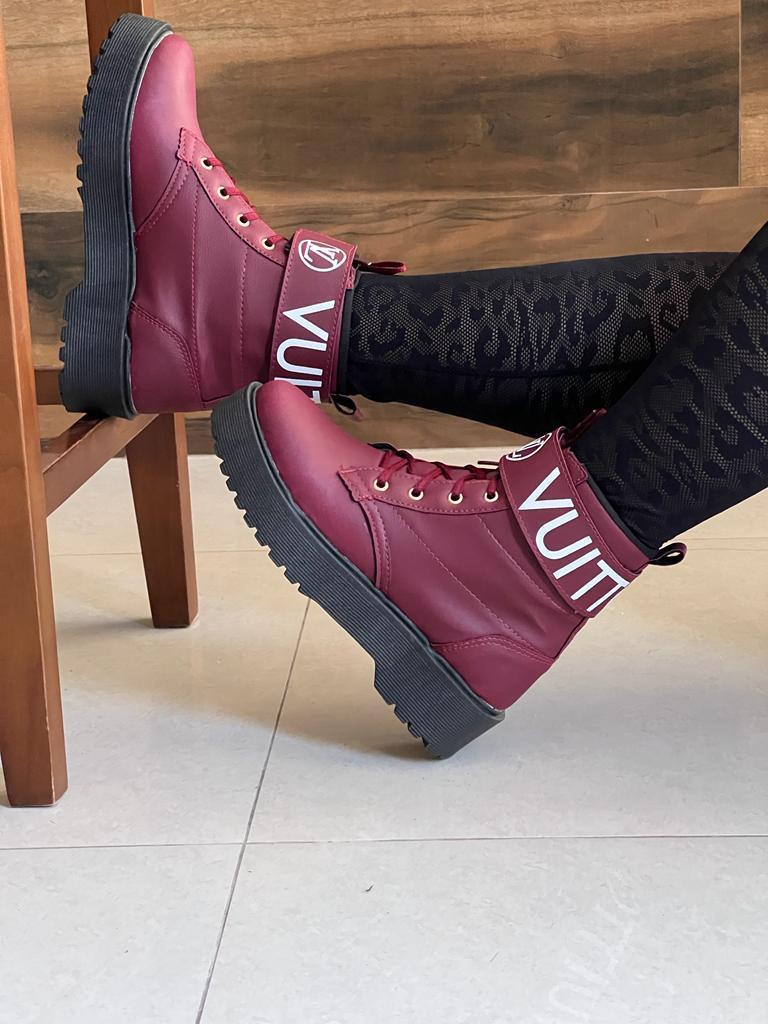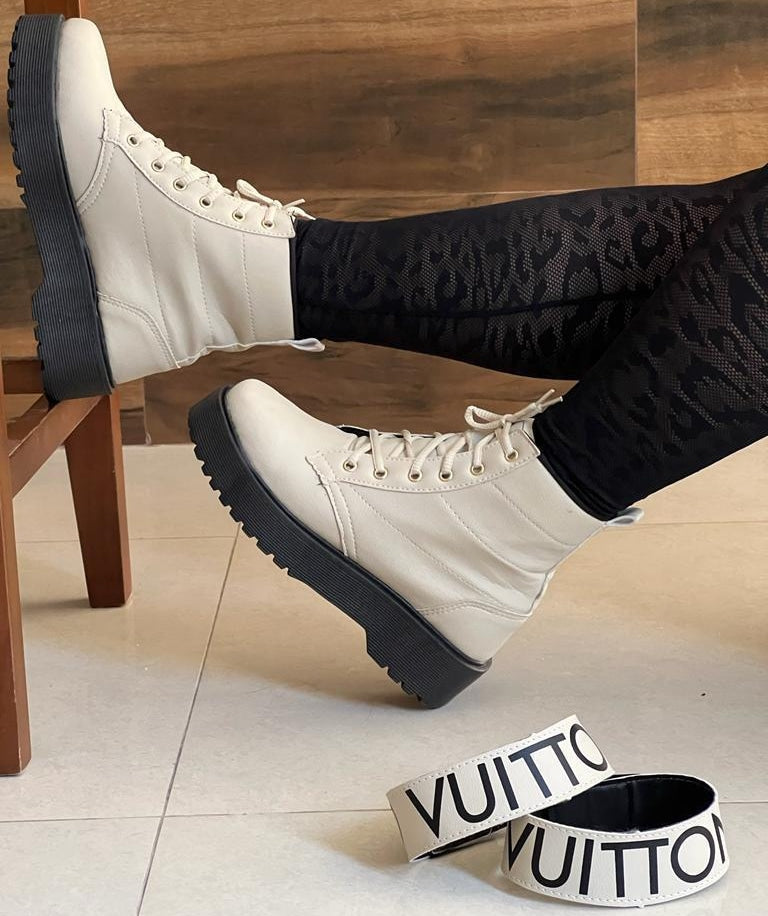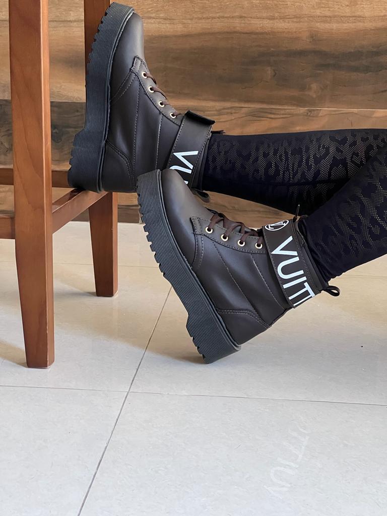 Bota em courino cano baixo com amarração superior e solado Tratorado com tira no mesmo material para ser usada na parte superior do tornozelo , forma tamanho normal , leve e estilizada