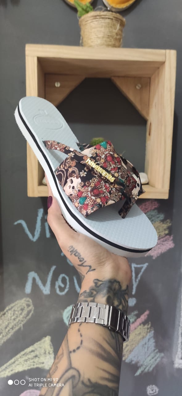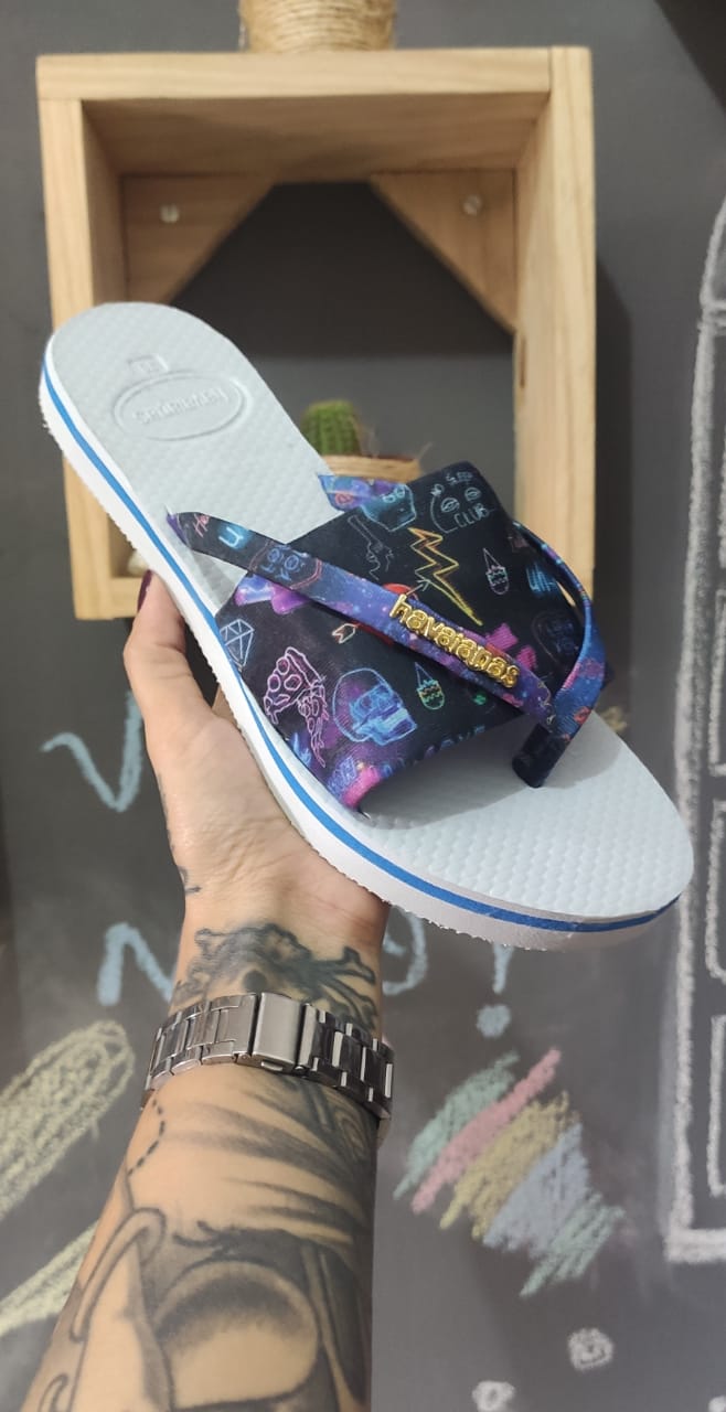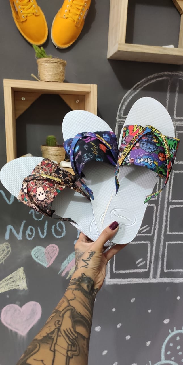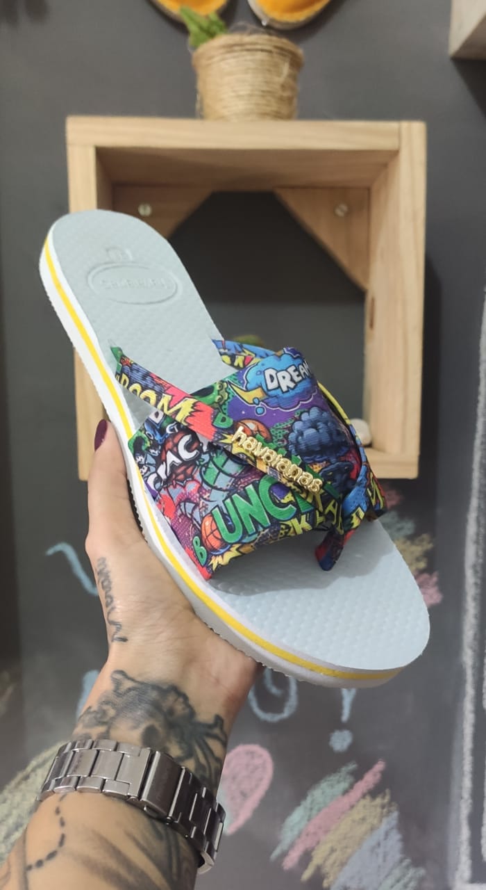 Chinelo havaianas com tiras largas em tecido e apoio de de tira de dedo Em borracha do mesmo material do solado , estampa difereciadas e alegre, conforto e resistência definem a peça