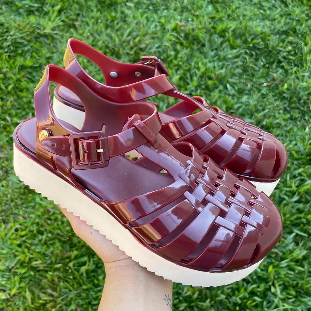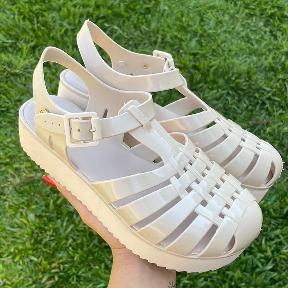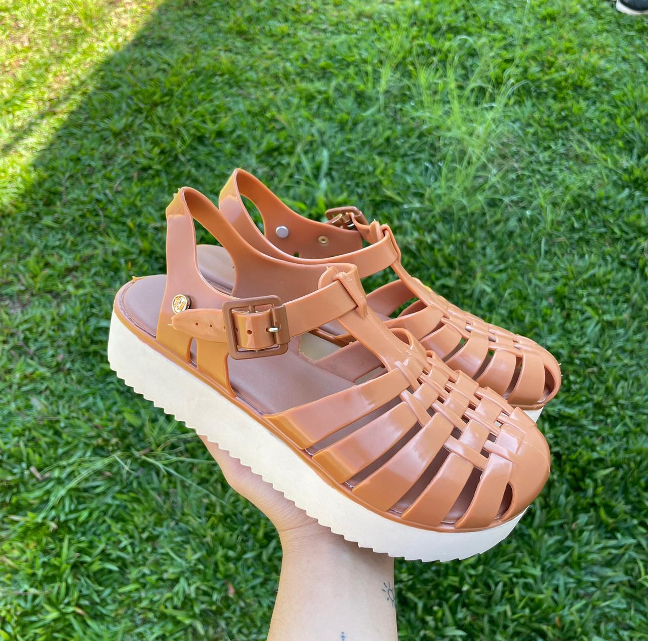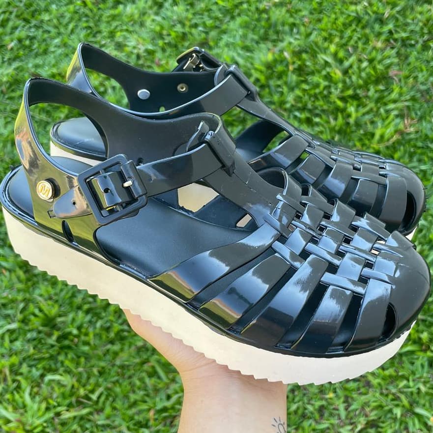 Sandália tratorado modelo aranha em plástico siliconado que não dá mau cheiro e não assa calça muito bem além de leve e confortável. Solado com 5 cm de altura emborrachado anti- derrapante
