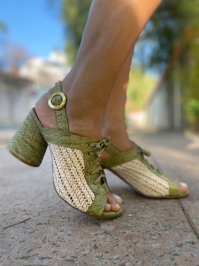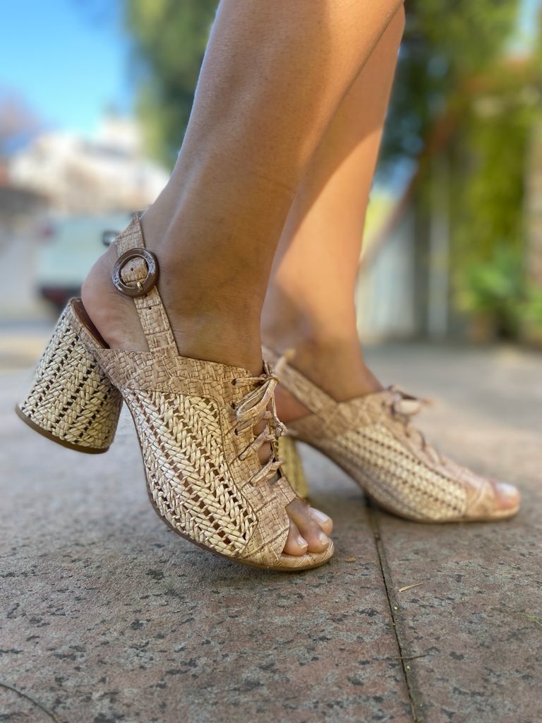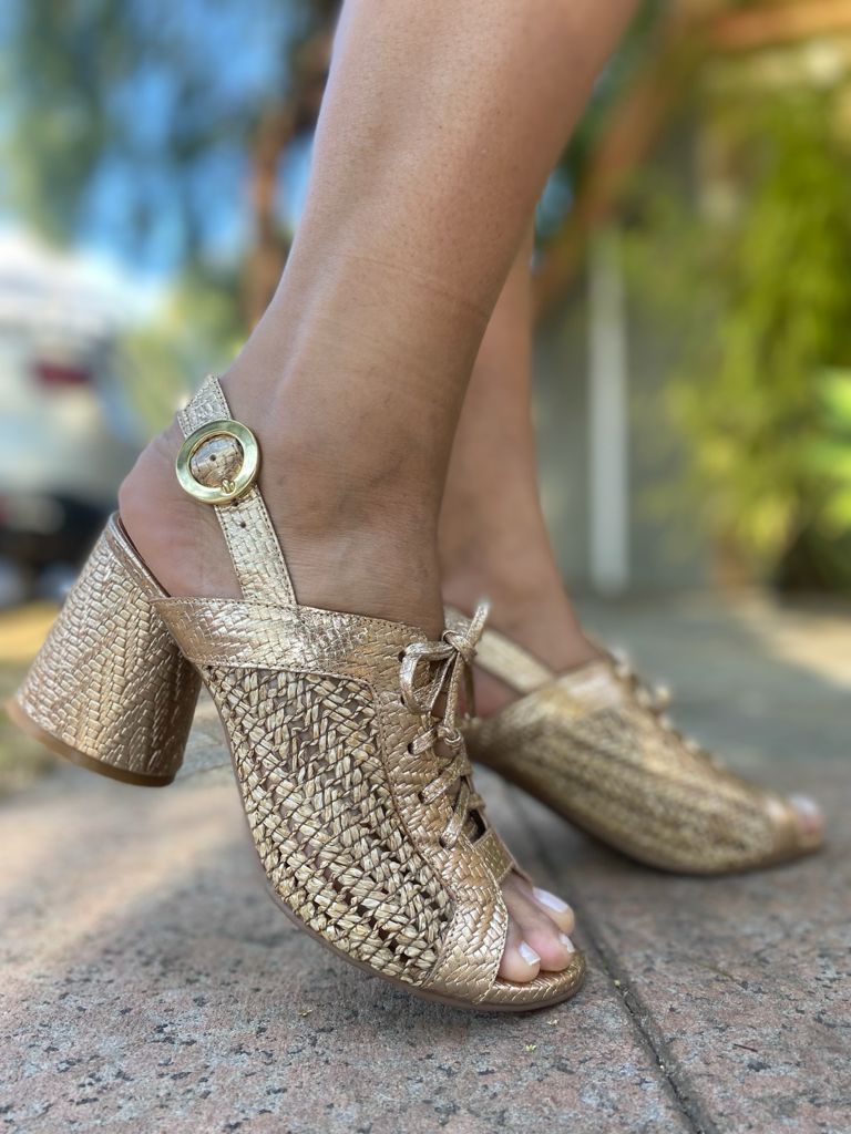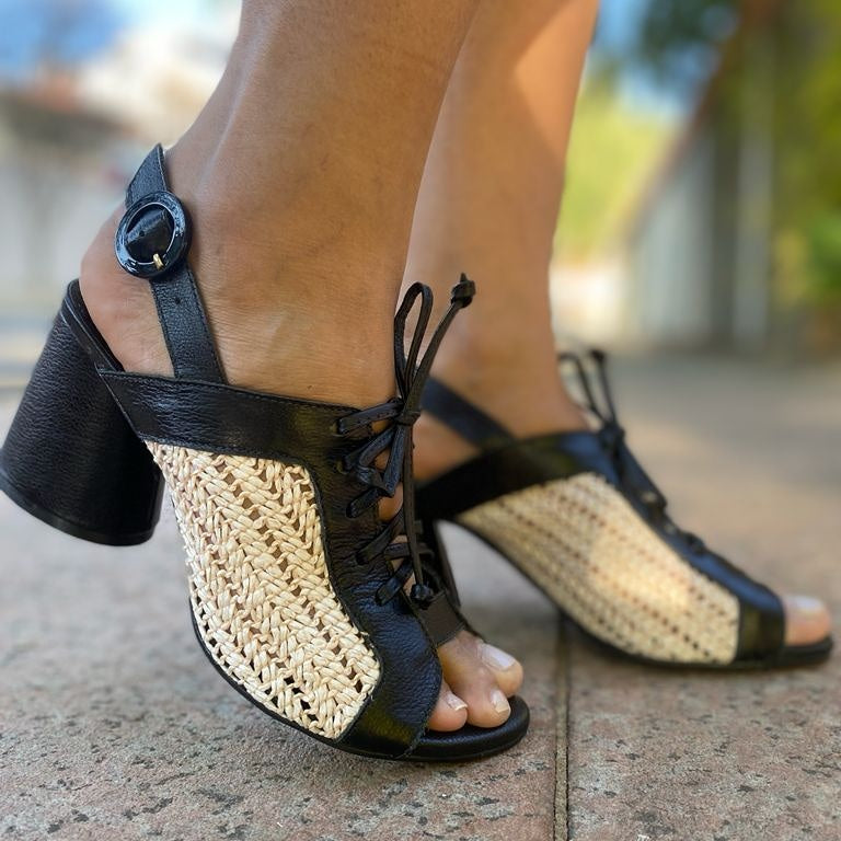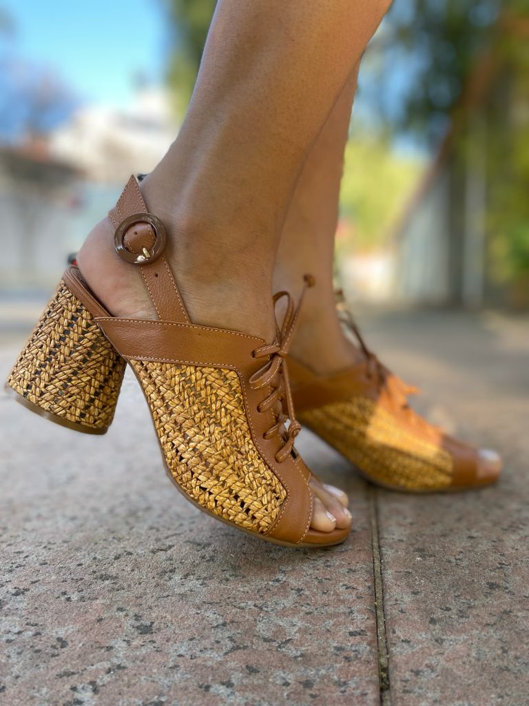 Sandália em couro natural com ilhós E cadarço para amarração superior e tira resistente com feixo traseira que permite maior conforto e segurança ao caminhar, salto rolo em PU forrado em couro Com altura de 6 cm