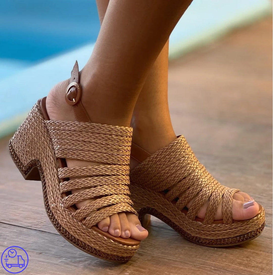 Sandália em couro trançado trabalho manual com parte superior e inferior no mesmo acabamento, excelente qualidade salto frontal de 4 cm e traseiro de 10cm
