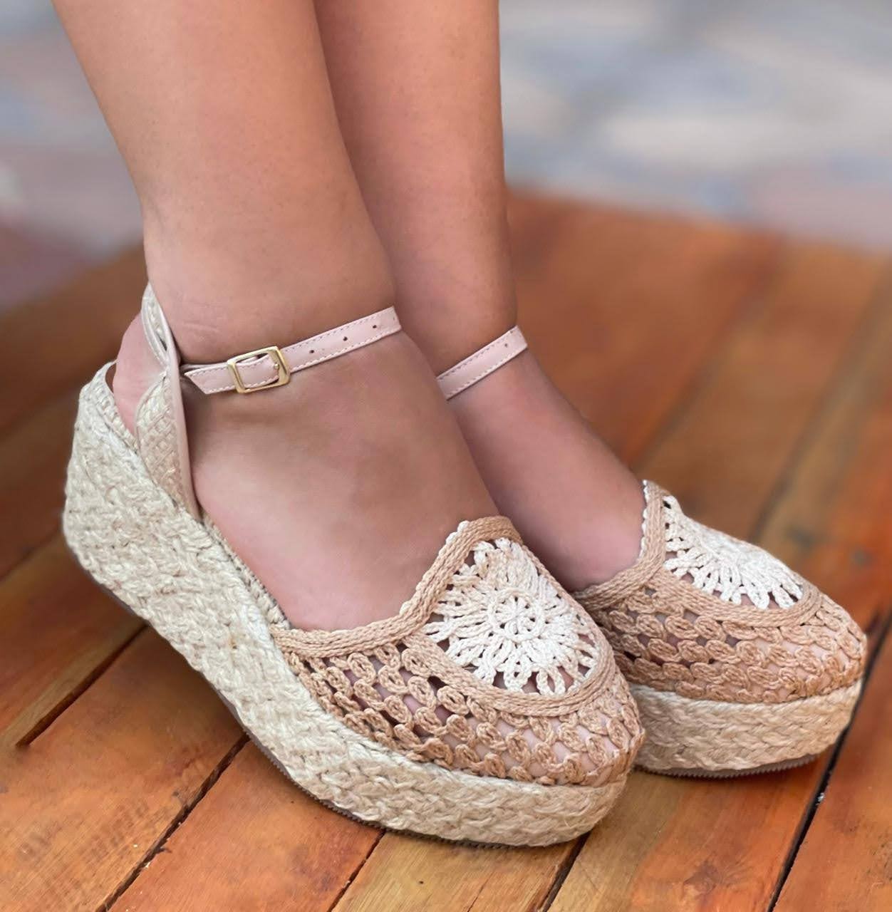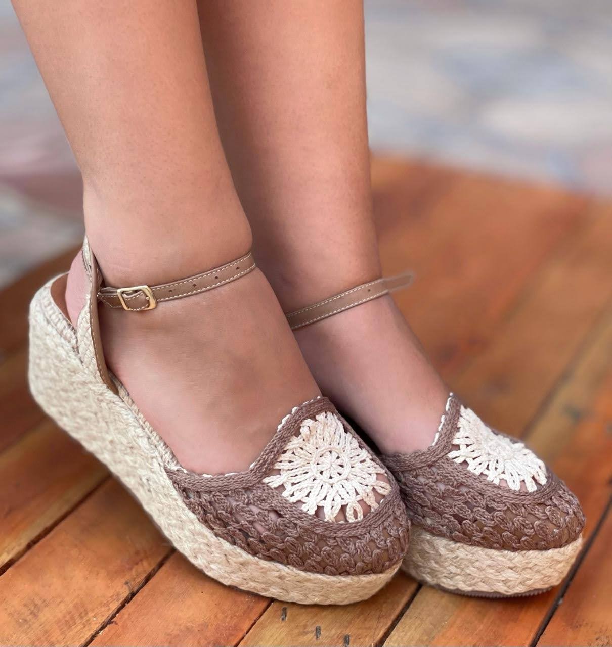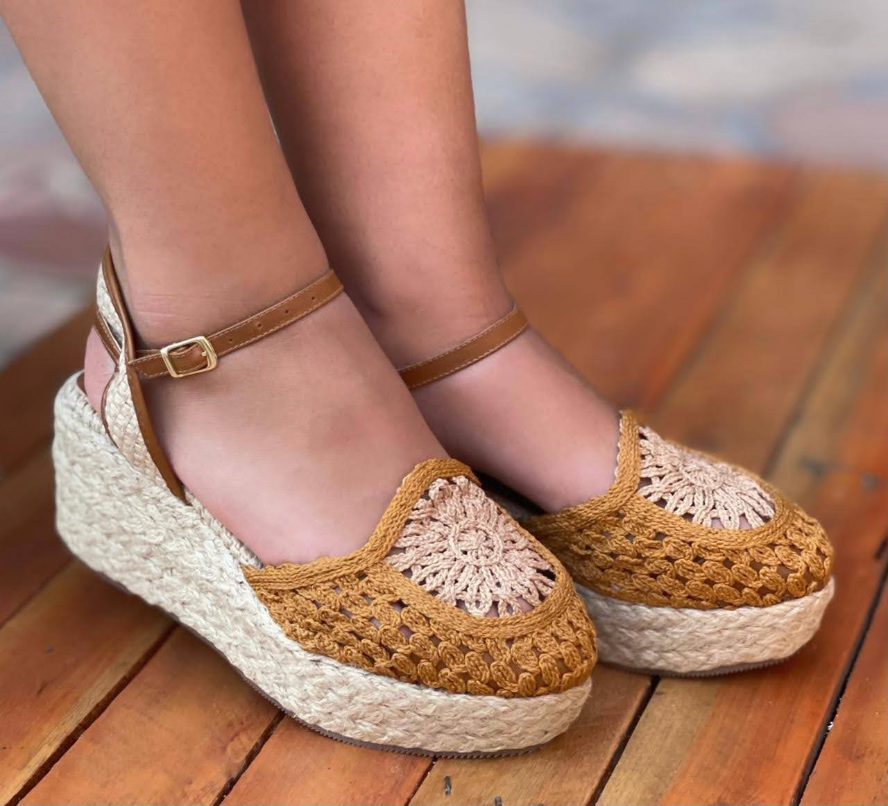 Sandália em couro com crochê de bastante na parte superior com detalhe mandala ,feixo no tornozelo em couro e apoio traseiro, solado em cortiça com altura frontal de 3 cm e traseiro de 6cm