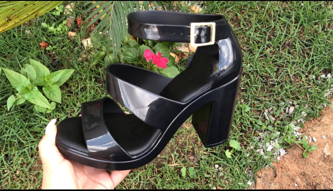 Sandália plástica com material resistente que não permite mal cheiro , produto de Excelente qualidade, solado em bloco De 8cm no mesmo material da sandália .