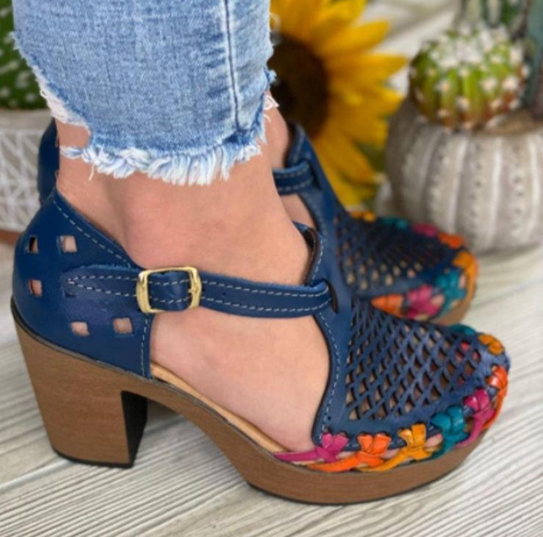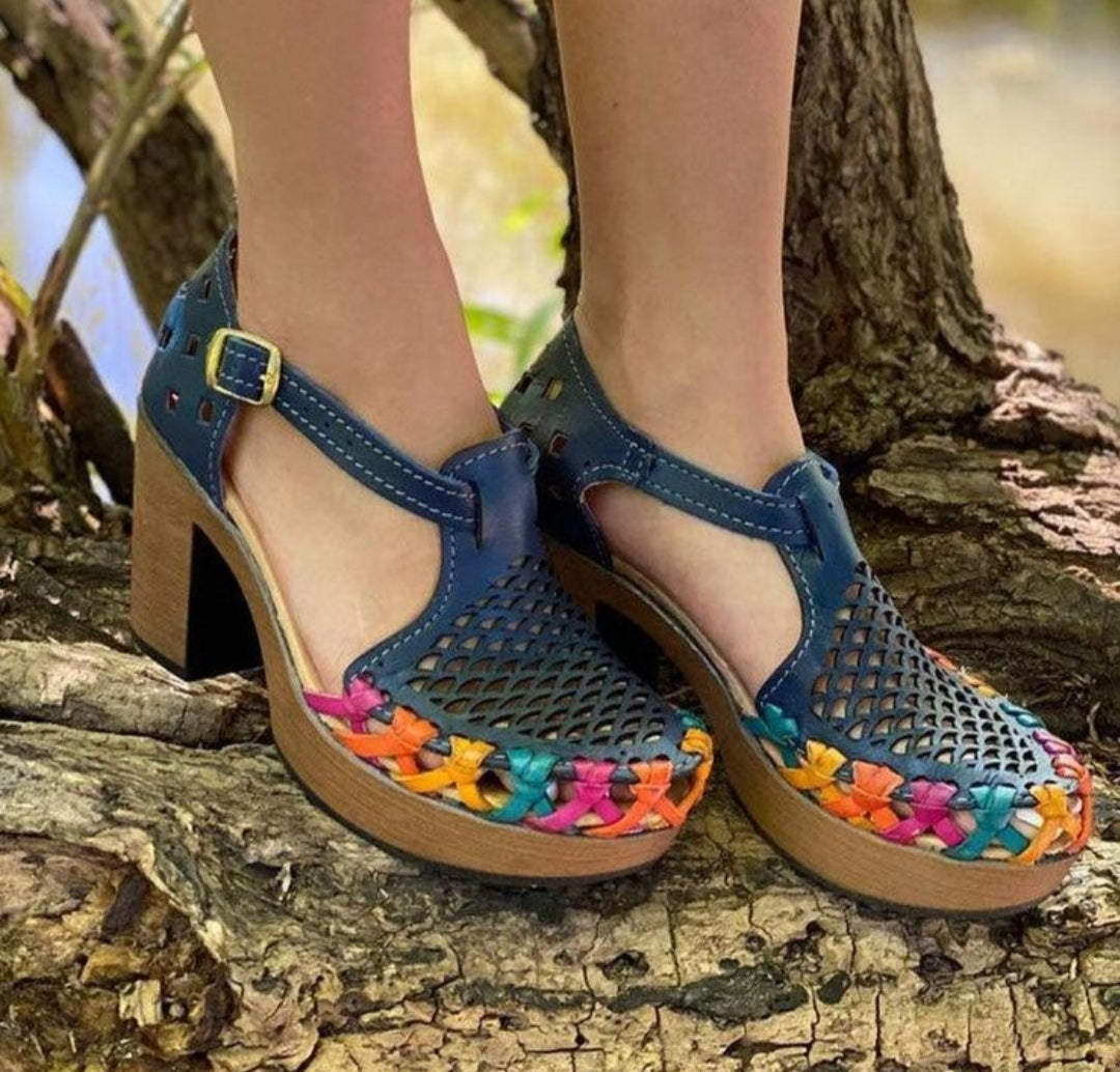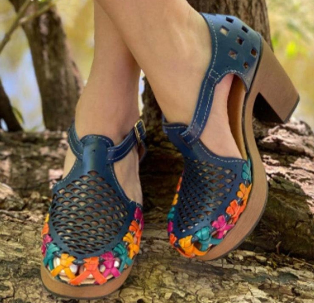 Sandália de cabeça redonda confortável respirável de borracha salto altura frontal de 5 cm e traseiro de 12 cm , Tratorado . Detalhes trabalhos na parte frontal