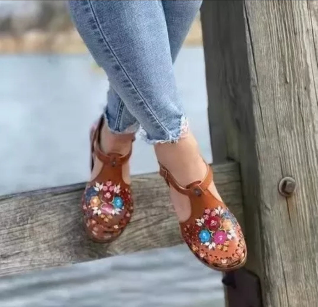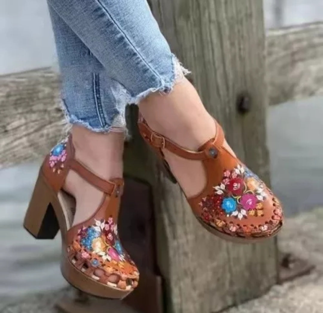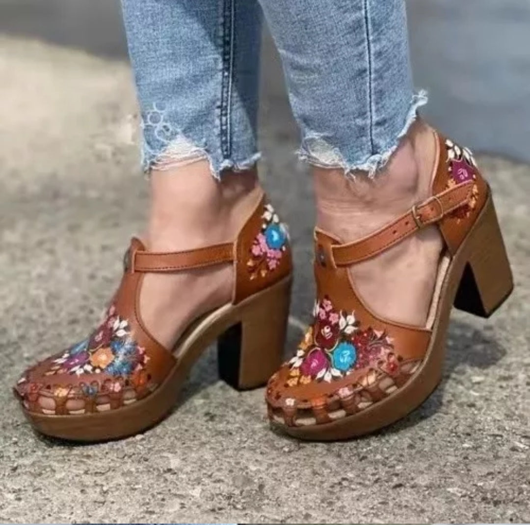Sandália de cabeça redonda confortável respirável de borracha salto altura frontal de 5 cm e traseiro de 12 cm , Tratorado . Detalhes trabalhos na parte frontal