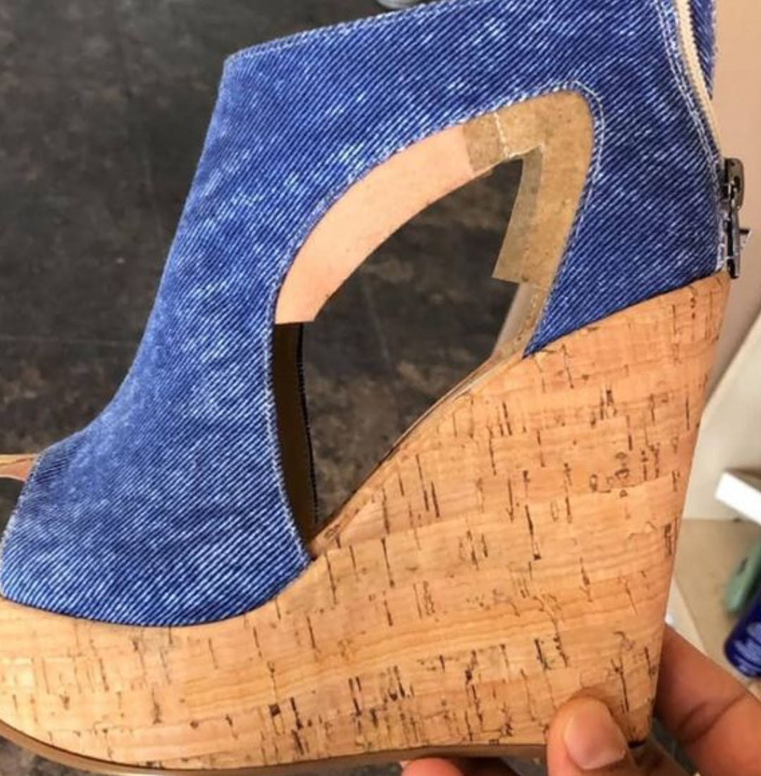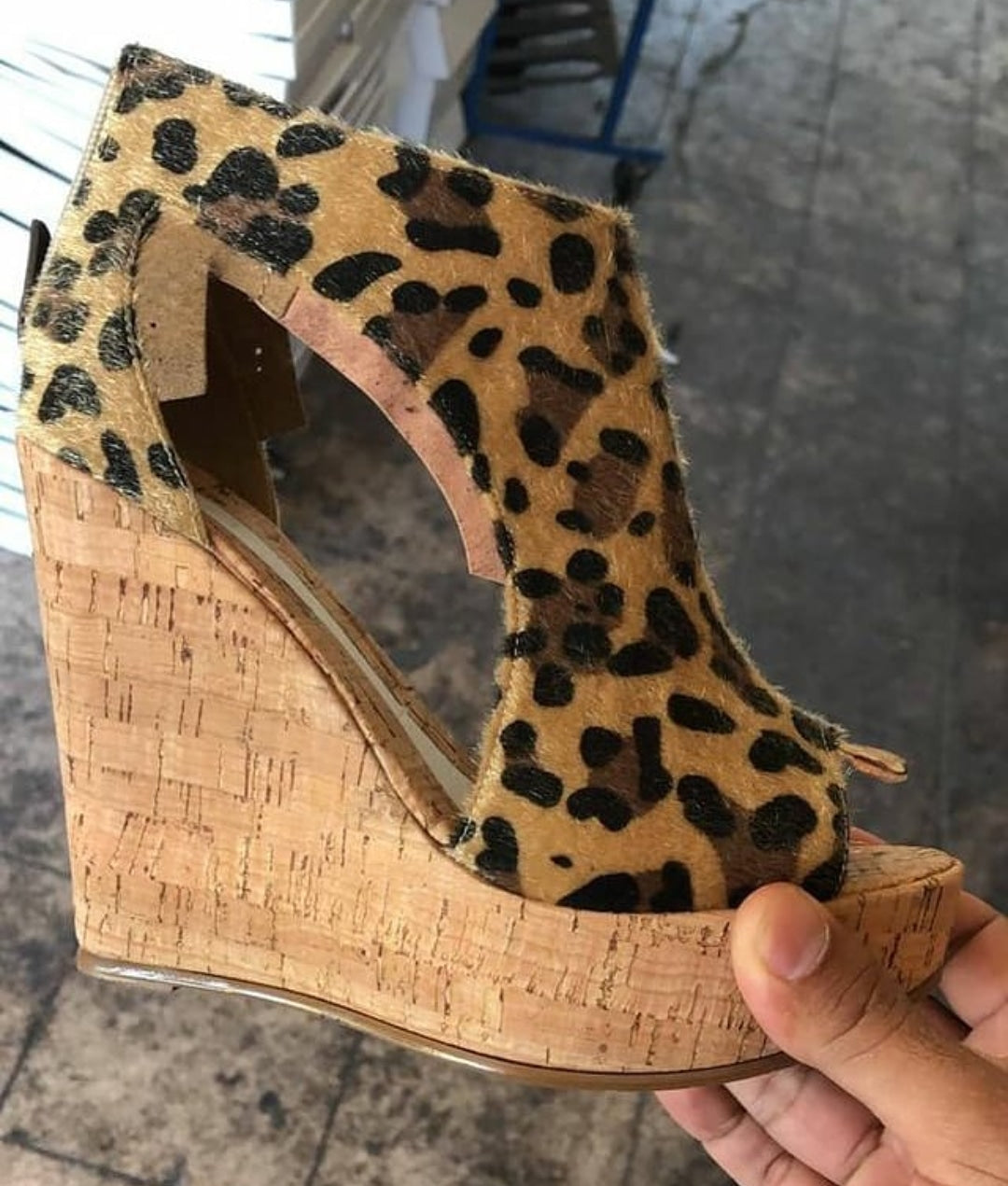 Sandália plataforma em dois matérias jeans ou veludo animal print com detalhe vazado nas laterais e cano alto, solado em cortiça frontal e zíper para abertura traseira. Soldados de medida 4cm e traseiro 10cm.