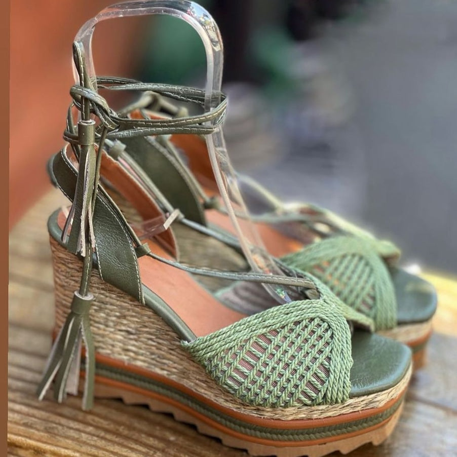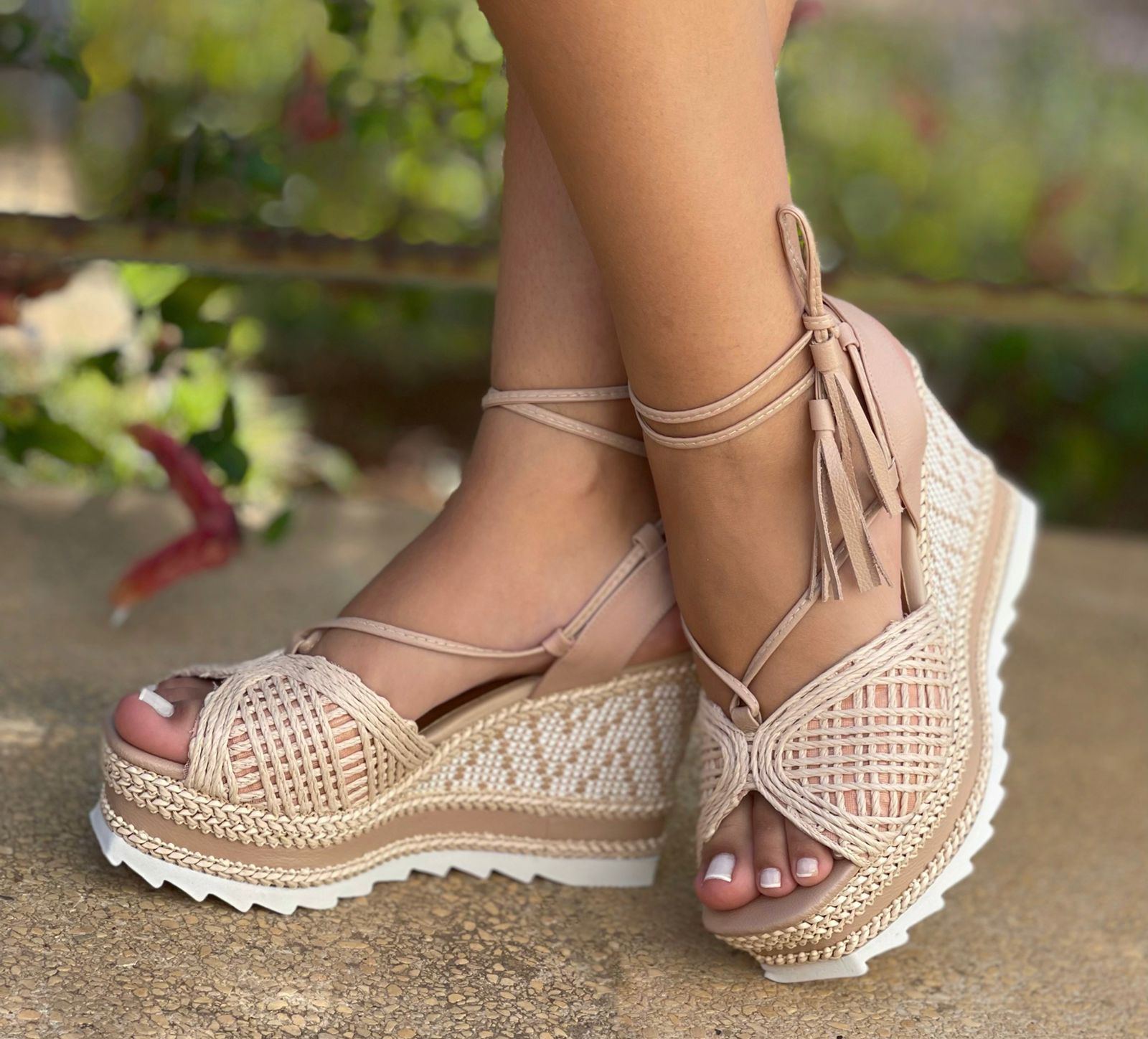 Sandália modelo plataforma gladiadora em couro com corda de amarração superior que não corta e não machuca , salto com 4cm frontal e 9 cm traseiro em PU forrado em couro e solado emborrachado tratorado.